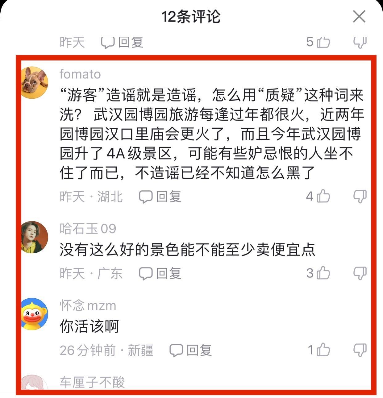 3、“遊客”造謠就是造謠,怎麼用“質疑”這種詞來洗? 武漢園博園旅遊每逢過年都很火,近兩年園博園漢口裏廟會更火了,而且今年武漢園博園升了4A級景區,可能有些妒忌恨的人坐不住了而已,不造謠已經不知道怎麼黑了。