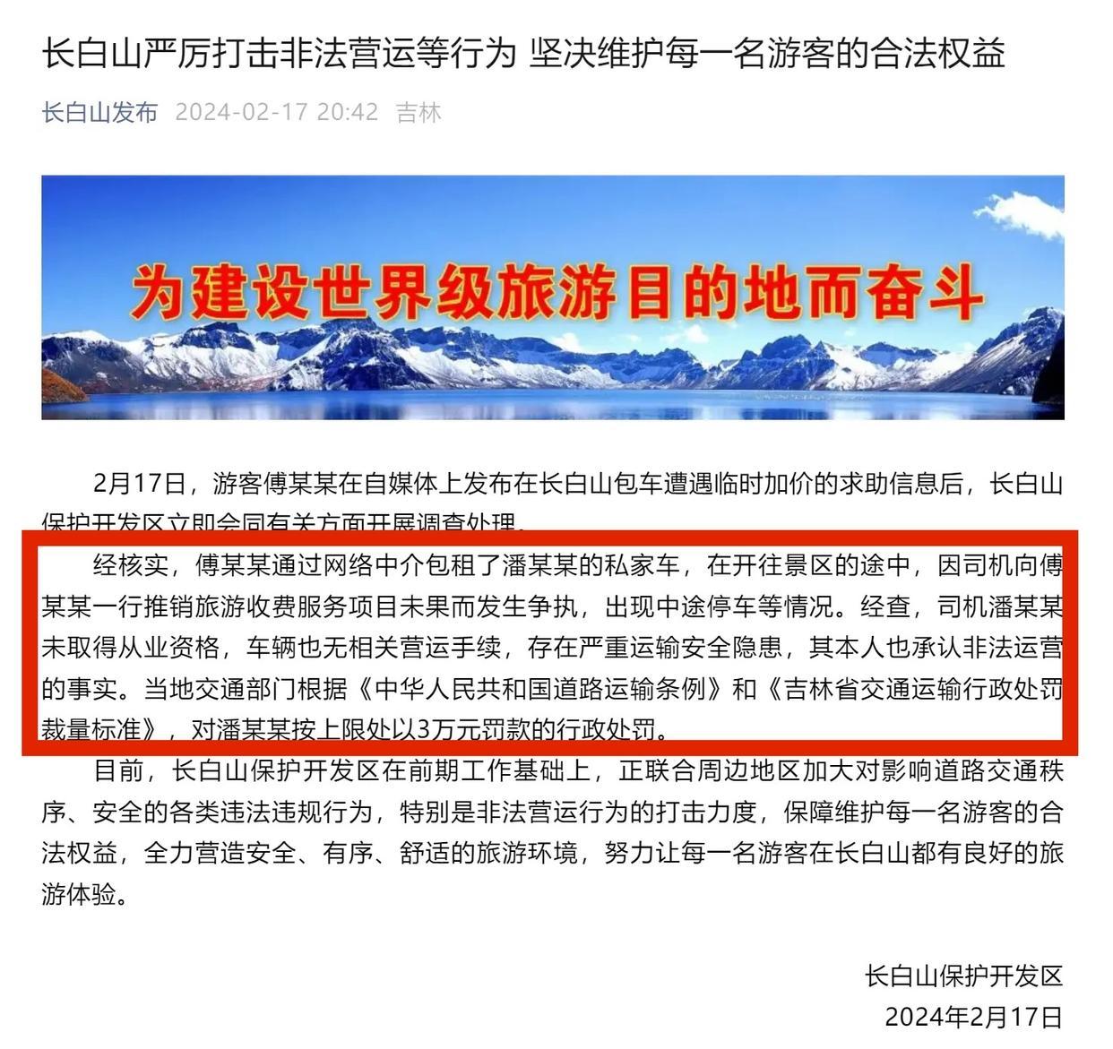 事情出來之後,吉林文旅和交通局都作出快速響應,最終定性處罰結果,司機無資質、私自攬客,根據交通法,給予司機處罰3萬元罰款,長白山會加大力度舉一反三對違法攬客宰客黑車司機進行嚴重打擊,營造一個良好旅遊環境和政策。
