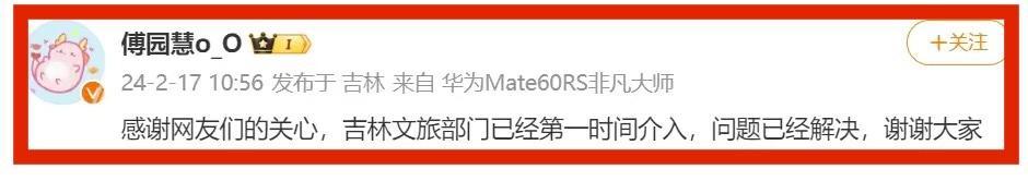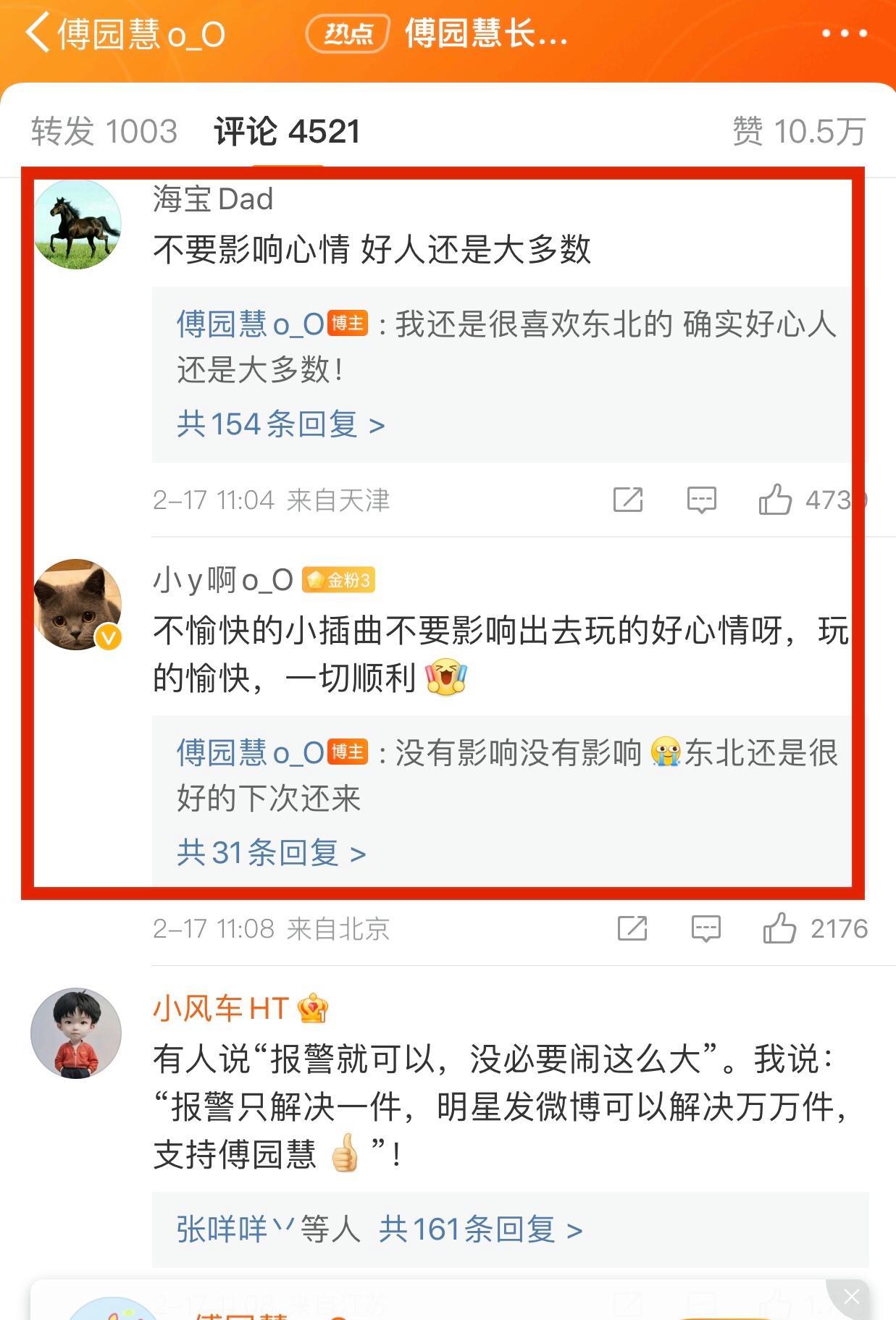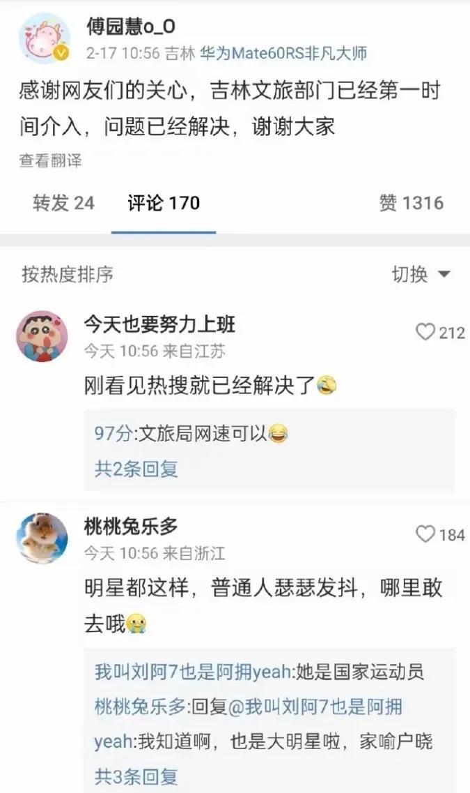 名人的微博具有很大影響力,得到了吉林文旅第一時間對接,傅園慧10點56分再次發微博說,事情已經解決,感謝網友關心,並且在留言區回覆了兩位網友安慰,她說東北人還是好人多,我還是喜歡東北的,也沒有因爲這次小插曲影響心情,下次還會再來東北旅遊。