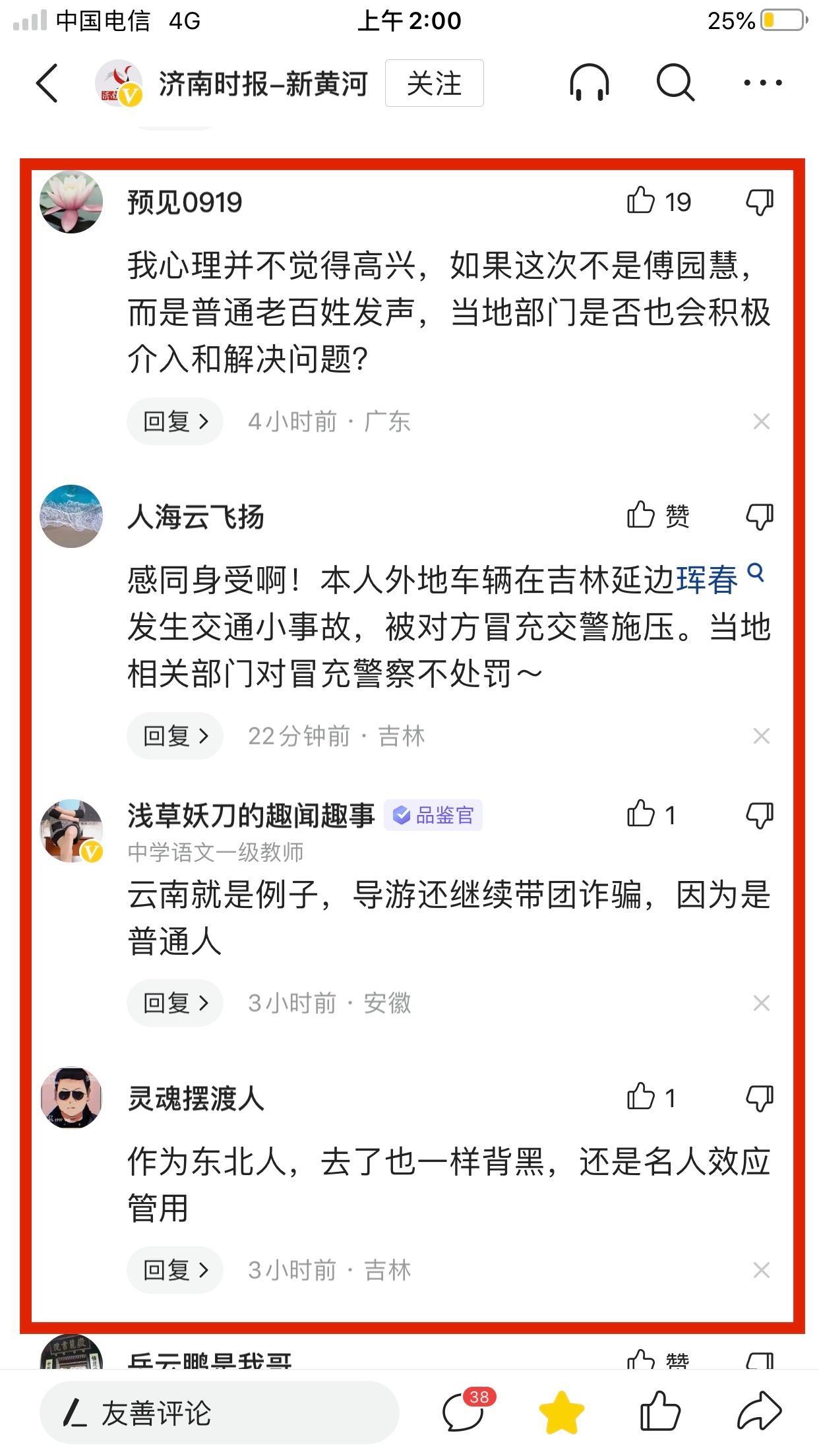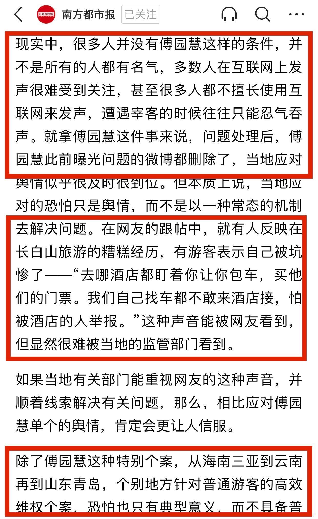 《南方都市報》發文點評:如果不是傅園慧,是一個普通遊客,是否會得到堅決,希望當地文旅能加大力度監督,背後是否有多少個傅園慧一樣案例,有網友反映到長白山旅遊,住酒店,酒店就時常盯着你包他們車,推薦你買他們門票,如果自己包私家車都不敢到酒店來接,怕被酒店給司機穿小鞋,也同時說明一個問題,黑車宰客都欺負到奧運冠軍頭上了,說明平時這些小商販黑車司機很猖狂、打擊力度不夠大。
