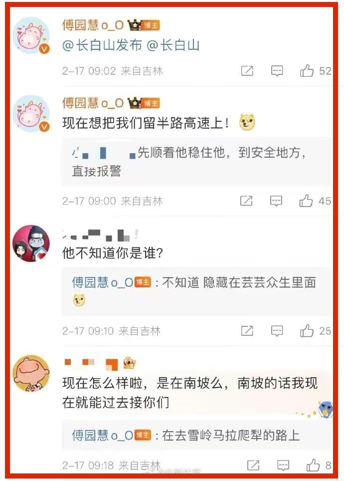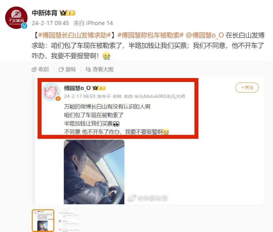 傅園慧傅園慧,1996年1月7日生於浙江杭州,中國女子游泳運動員,這次在吉林長白山包車被宰,事情得從2024年2月17日說起,從她微博看在吉林2月14日發的雪景照片,她們一行人大約是四位女生出鏡,從她給網友留言中消息透露,她們是去長白山雪嶺景區玩馬拉爬犁的路上,司機半路給她們一行人推薦景點門票等項目,司機推銷結果失敗,司機就要求他們加錢買門票,拒絕之後,司機就不開車,把她們甩在高速公路上,不得已發微博求助,大約是早晨8點59分,微博求助信息發出來,立馬多位吉林網友給她留言,叫她先穩住司機,報警、網友們會去接她們。