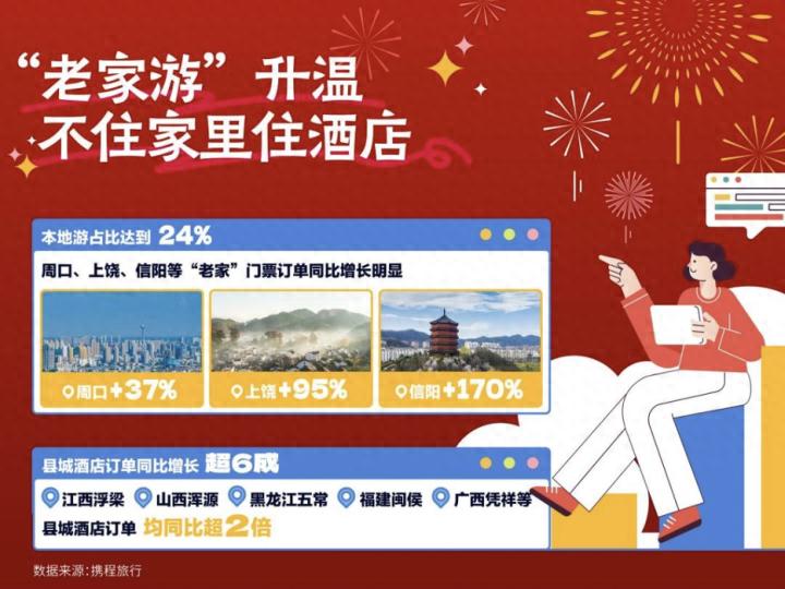 根據攜程的數據,8天長假以及異地探親潮,使得春節假期多段旅行更加普遍。春節期間,2個及以上城市多段出遊訂單佔比超過20%,較去年提升3個百分點。春節返鄉潮使得旅遊熱度更爲分散,衆多中小城市“老家遊”火熱。春節假期,本地遊佔比達24%,帶動“老家”景區、公園、商圈、民俗活動等人氣火爆。河南周口、江西上饒、河南信陽等地區門票訂單分別同比增長37%、95%、170%。“老家”旅遊火熱也體現在中小城市旅遊升溫、縣城酒店預訂火熱。