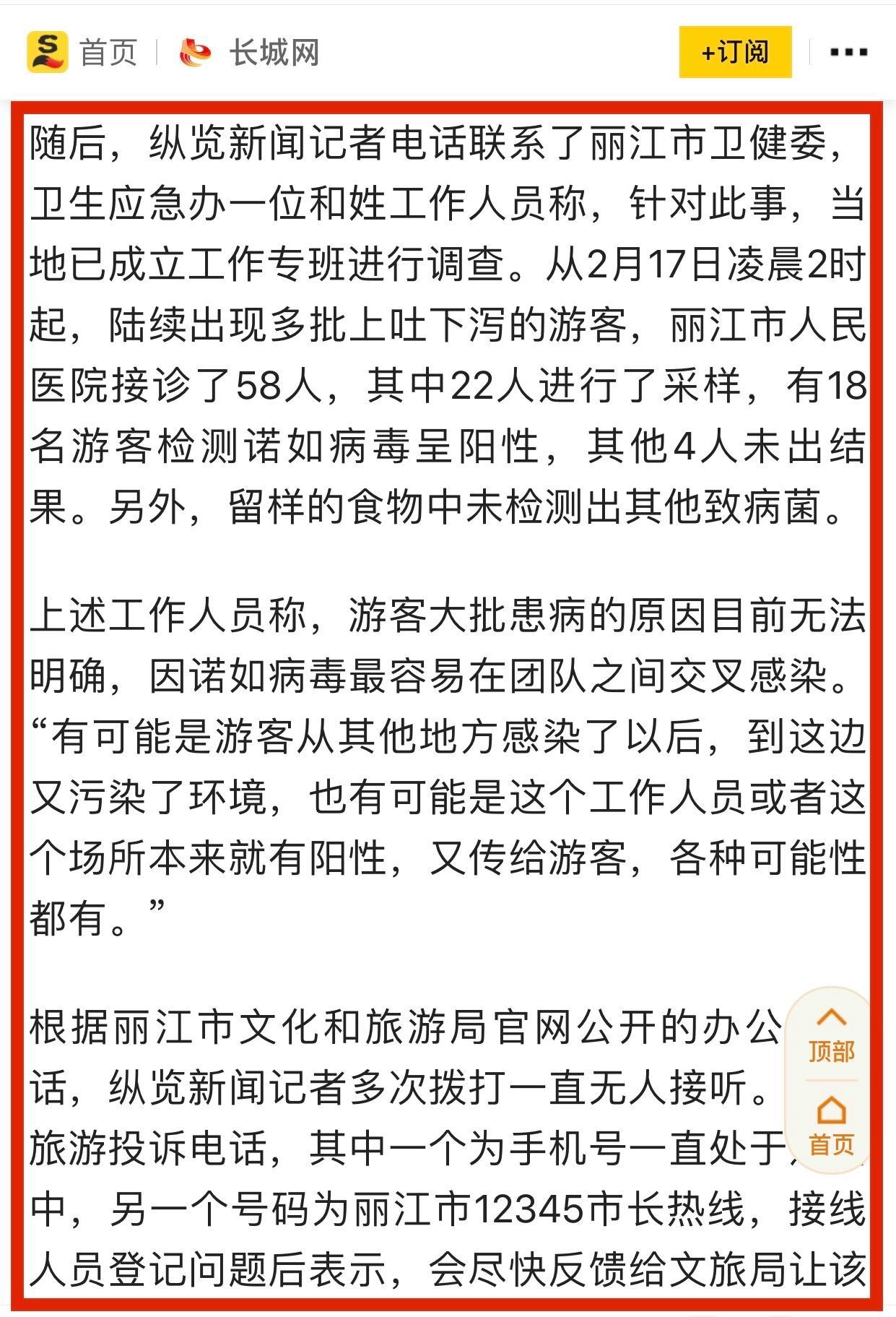 目前麗江衛健委已經證實遊客食物中毒這一說法,麗江市人民醫院接診了58人,其中22人進行了採樣,有18名遊客檢測諾如病毒呈陽性,其他4人未出結果。另外,留樣的食物中未檢測出其他致病菌。