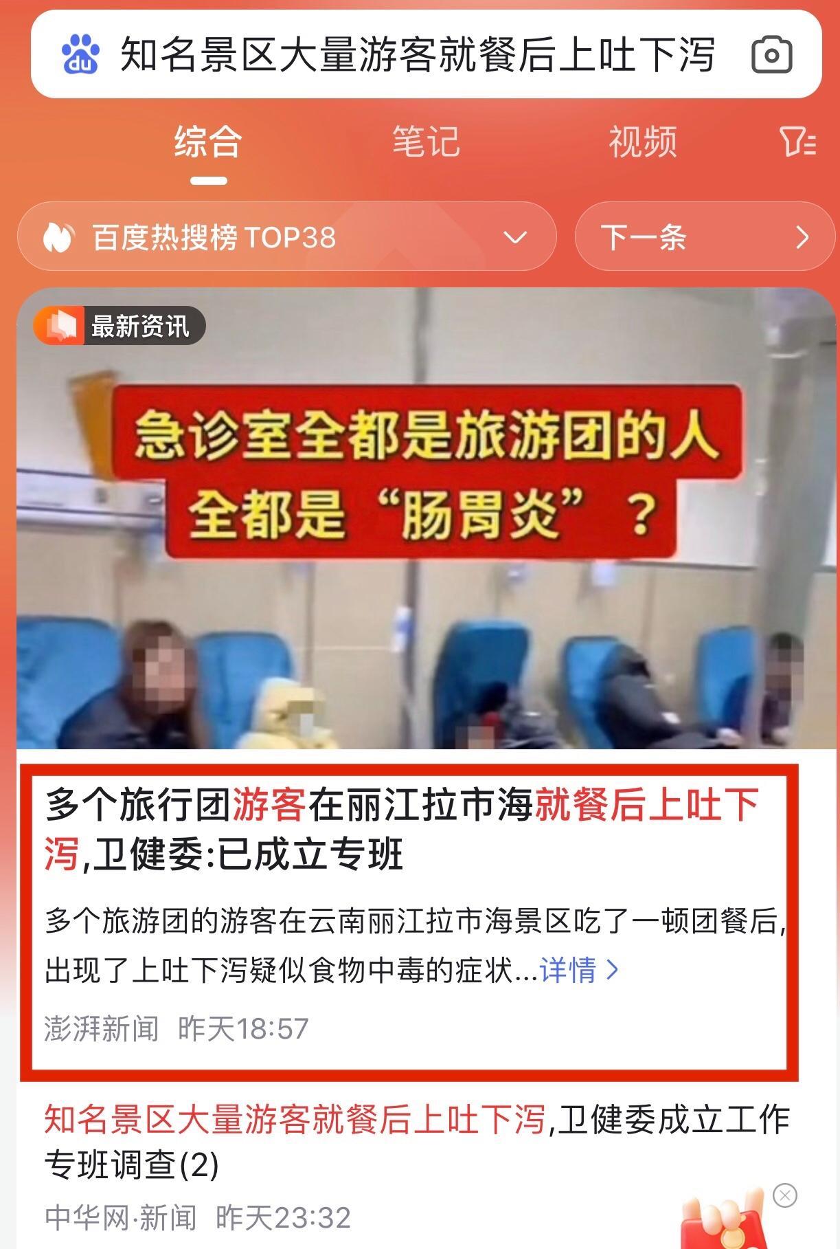 事發2024年2月17日凌晨兩點多,有旅遊團遊客出現上吐下瀉,然後到麗江市人民醫院就診,結果有遊客發現前後有不同旅遊團來就診,大家交流中發現是共同在拉市海景區一個跑馬場一個餐廳用了團餐,疑似食物中毒。