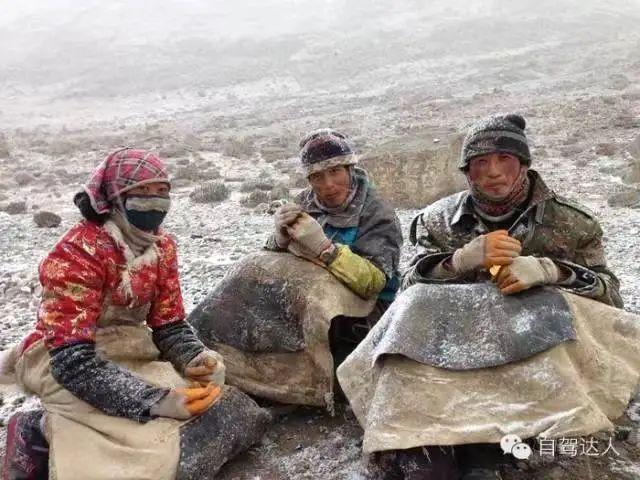 過完橋,赫然發現二位藏族小夥和一位藏族姑娘淡定地坐在風雪中談笑風生,頓時爲之一振,馬上邊拉開攝影包邊說:我給朱古力給你們,但不知夠不夠。正好還有最後的三塊,真是天意,沒讓我爲難。得知他們已磕了七天長頭,準備再花五天磕長頭回到塔青,真心欽佩!