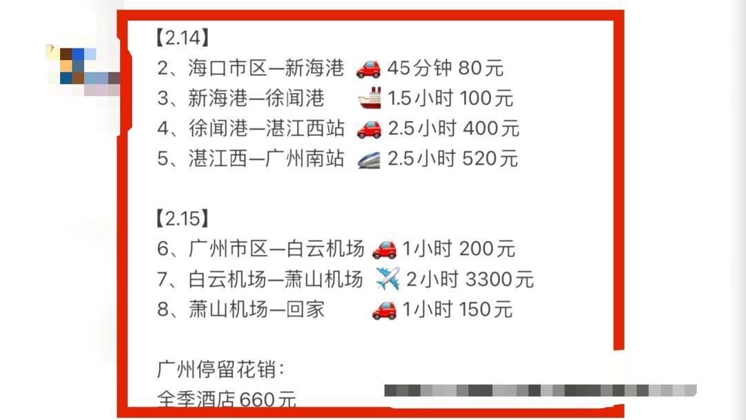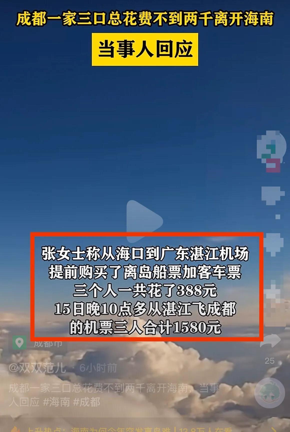 3、成都一家三口人在海南過春節,返程時候機票太貴,他們有經驗,提前2周在app上訂了離島船票和客車票,然後從海口到湛江船票三人花費388元,三人從湛江到成都機票一共1580元,最近幾天從海口返回成都,一共花費不到2000元,這家人海南返程應該算是最便宜路費了。