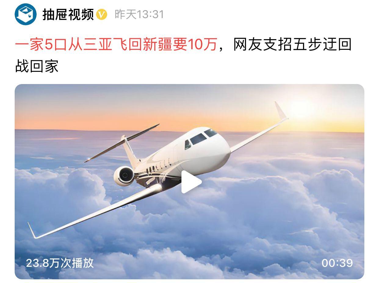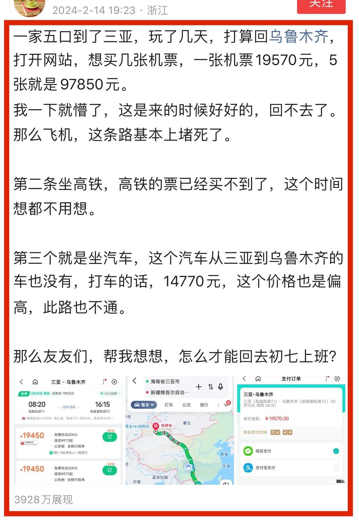 1、新疆一家五口人到三亞過春節,然後到了返程一看機票傻眼啦,需要19570元一張,5人機票一共接近10萬元,三亞到烏魯木齊高鐵沒有票,再選擇打車,也要14000元,一位ip地址在浙江博主給這家人發文求助,希望網友支招,2400多萬網友爲新疆一家人獻計獻策,研究出啦五步路,先從三亞坐高鐵到海口輪渡,到達廣東湛江,再坐大巴到廣東能飛烏魯木齊機場,這樣就省錢啦。