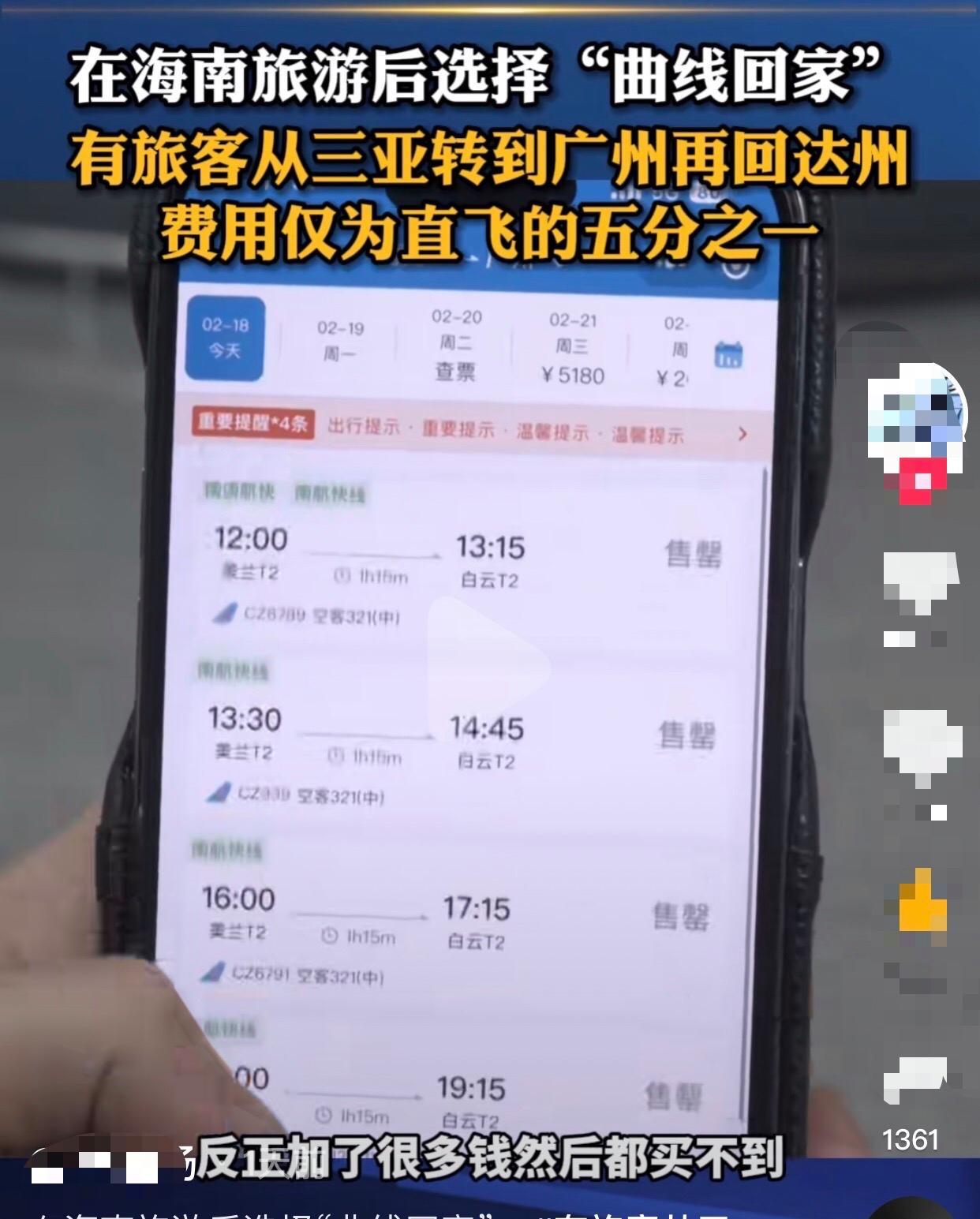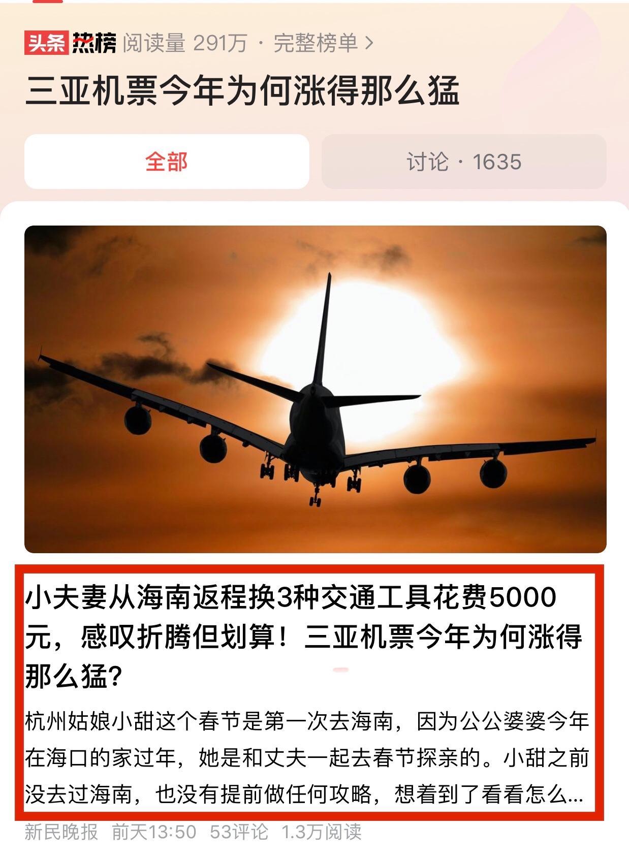 2、杭州一對夫妻因爲爸媽在海南過年,他們是大年初二去看望爸媽,當他們在海南陪爸媽度過了3天假期,返程時看機票漲價了,兩人回杭州要3000多元機票,並且只能從瀋陽、哈爾濱、北京幾個地方中轉,這個機票貴就算了,還折騰人,要20個小時或者30個小時飛回家。