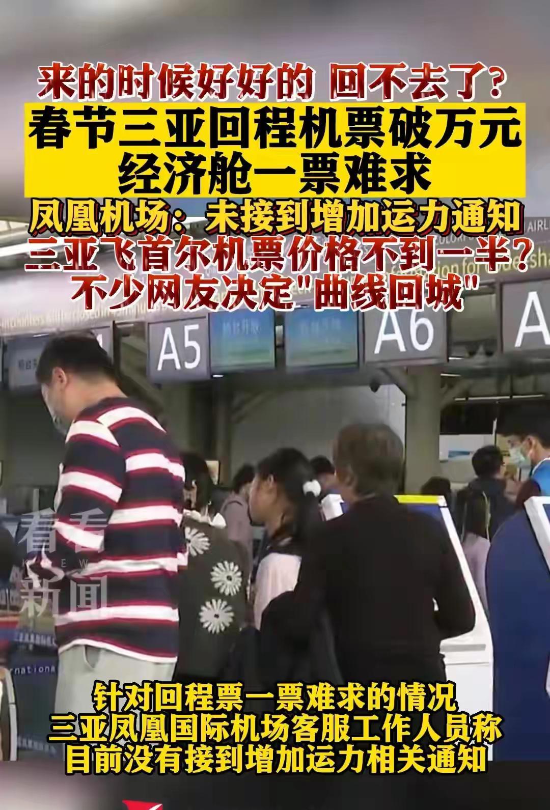 今年返程最受關注旅遊目的地就是海南三亞,春節假期接近尾聲,返程高峯還在繼續,海南三亞機場每天返程旅客依然每天有兩三萬人次,很多從北方到三亞過年的遊客只要1000多元一張機票,可是返程時候,經濟艙被有經驗的遊客提前預定完了,就剩下公務艙,公務艙價格幾乎超過一萬元一張機票,最便宜地方也要八九千元,滯留三亞的遊客說來的時候好好的,可是回不去了。