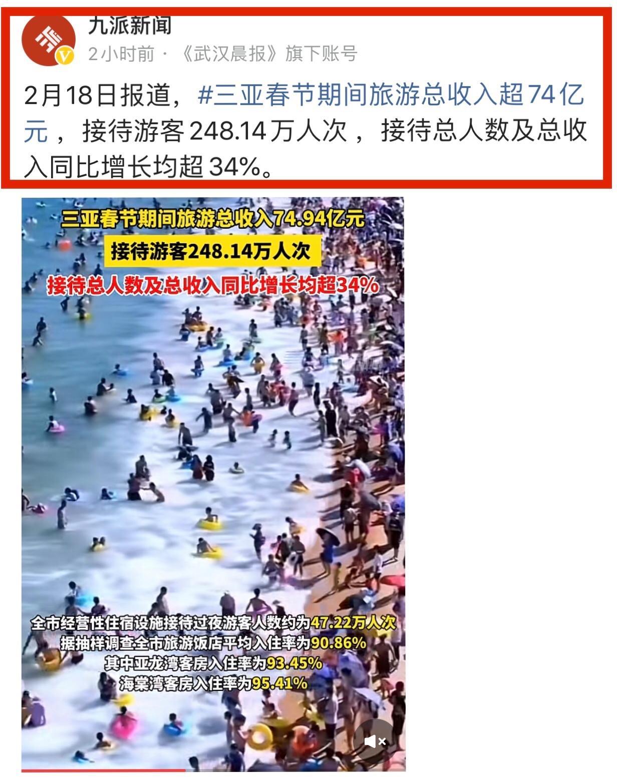 三亞返程高峯火遍全網,根據《九派新聞》報道:三亞春節假期接待遊客248萬人次,實現旅遊收入74億元。