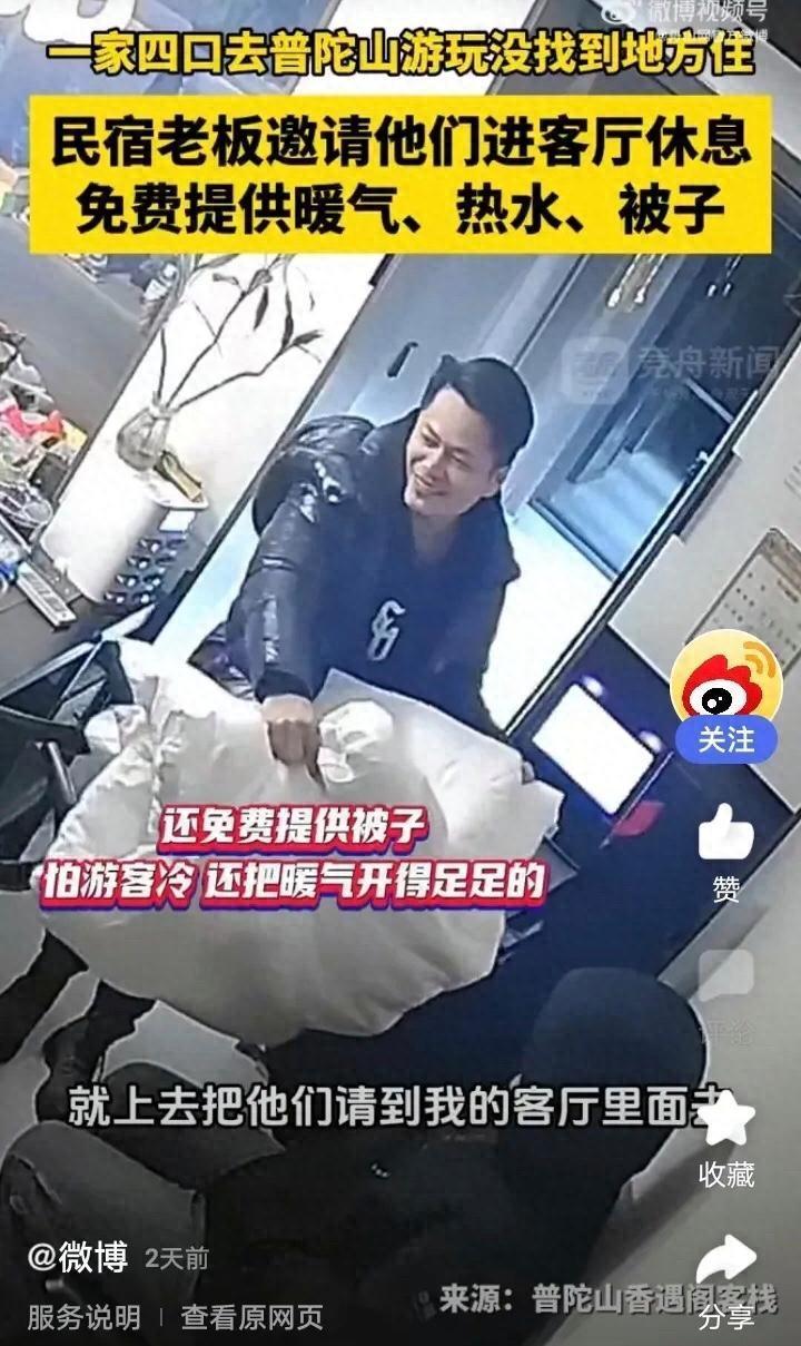 2月12日晚間,凌晨普陀山溫度還是很冷,鄭先生凌晨到公廁解手,發現公廁大廳內有三名遊客蜷縮着,被夜晚寒風凍得瑟瑟發抖,鄭先生上前詢問四名遊客情況,他們是一家四口來普陀山旅遊,沒有訂到酒店,準備在廁所度過一夜,鄭先生很同情遊客難處,立馬邀請三名遊客到自己民宿大廳住宿,給遊客提供沙發、躺椅、被子、熱水,開足暖氣,讓他們好好休息一下,遊客一家四口甚是感激,提出要付錢,民宿老闆鄭先生說這哪能收錢呀,我要收你們錢,就不會叫你們來客廳住啦,第二天凌晨五點,一家四口疊好被子,告別鄭先生。