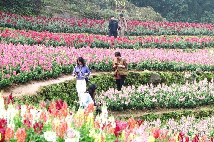 遊客在風鈴谷賞花合影 孟萍 攝