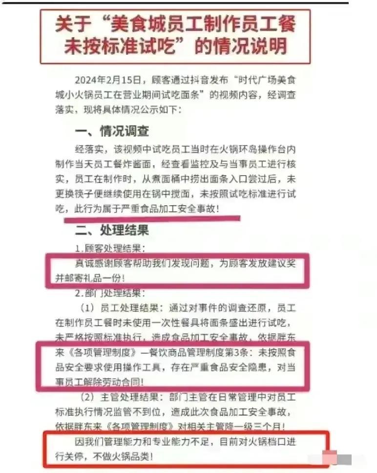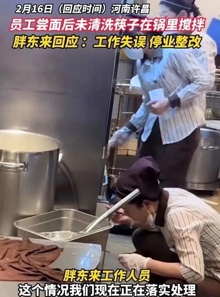 6、2024年2月15日胖東來流出員工試喫麪不清洗筷子,胖東來爲了保障對外面宣稱品質服務第一,對員工進行開除,解除勞動合同,關閉火鍋檔口,然而專家批評處罰過重,有媒體報道,被開除員工是降級到其他工種當普通員工,胖東來的優質服務,大衆已經把它架到顯微鏡下,不能容忍一粒沙子差錯。