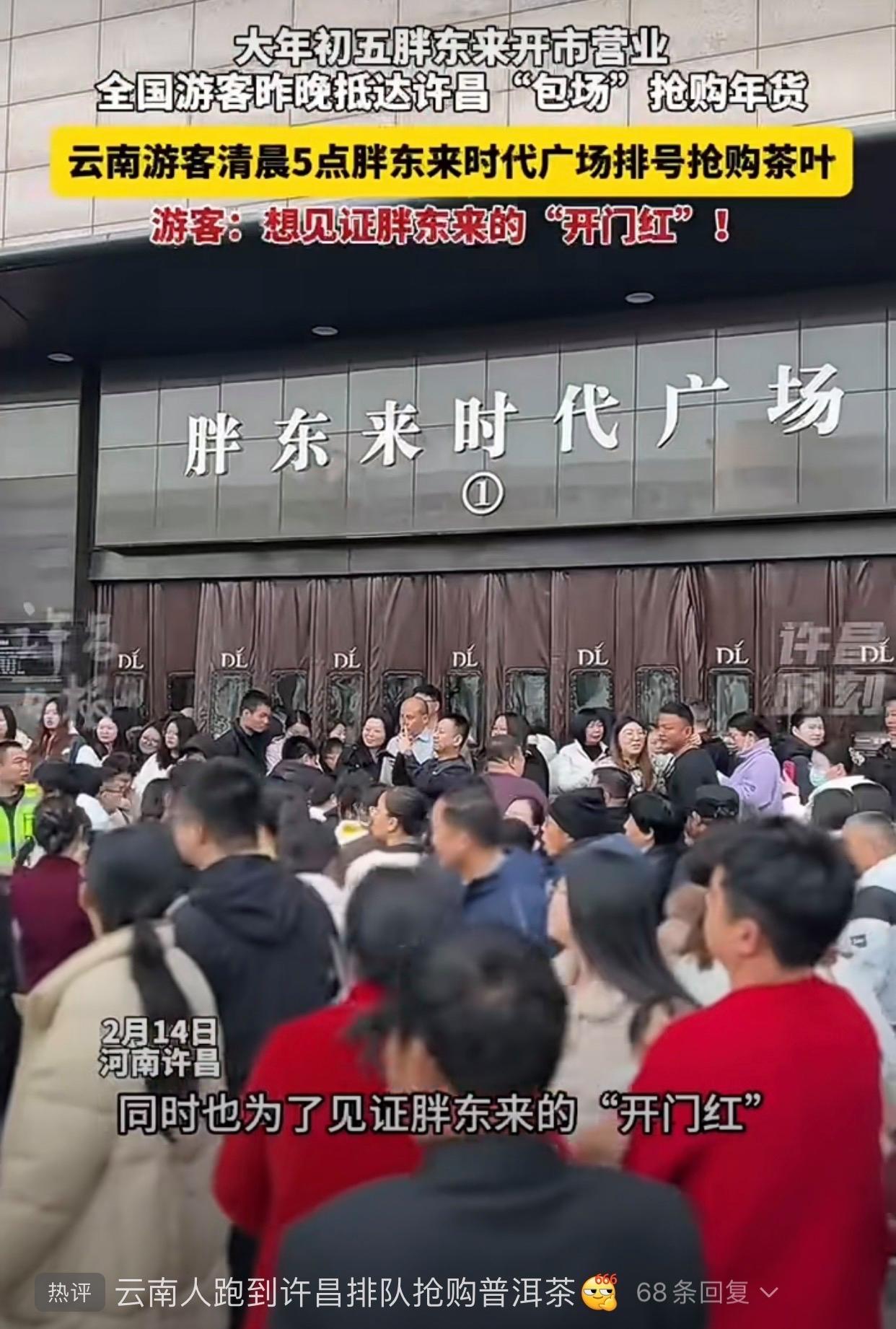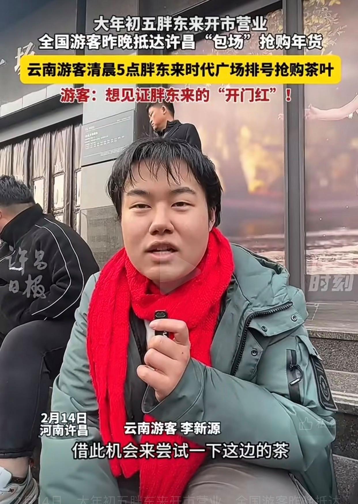 一位來自雲南昆明的遊客,親自講述大老遠跑來胖東來,有三個想法:第一個就是經常在網上刷到胖東來的視頻,想親自到現場感受一下氛圍和服務。第二就是想見證胖東來新年開門紅。第三就是想在胖東來買到物美價廉的雲南普洱茶,普洱茶產於雲南,昆明人來胖東來買茶葉,因爲胖東來的普洱茶賣得比雲南便宜。