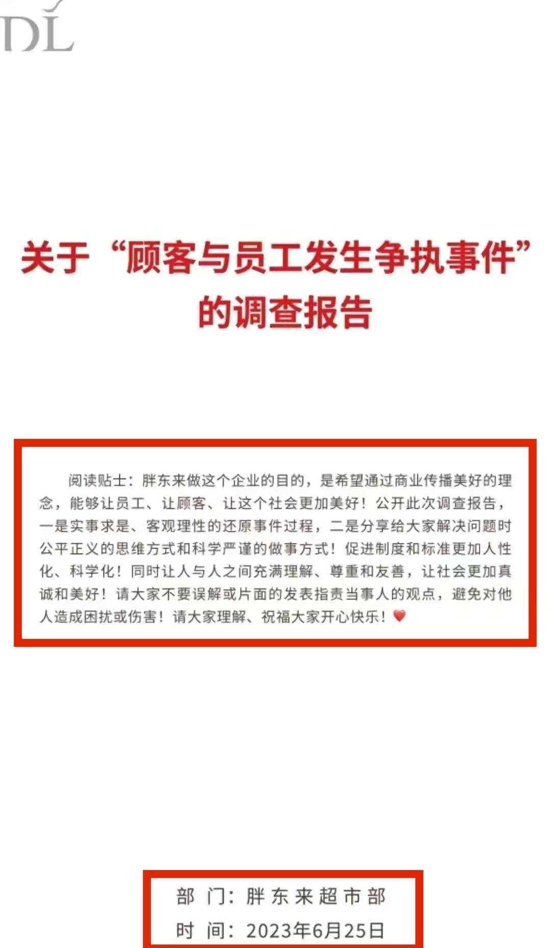 3,2023年去年6月,胖東來又因“顧客與員工爭執,推8頁調查報告上熱搜。