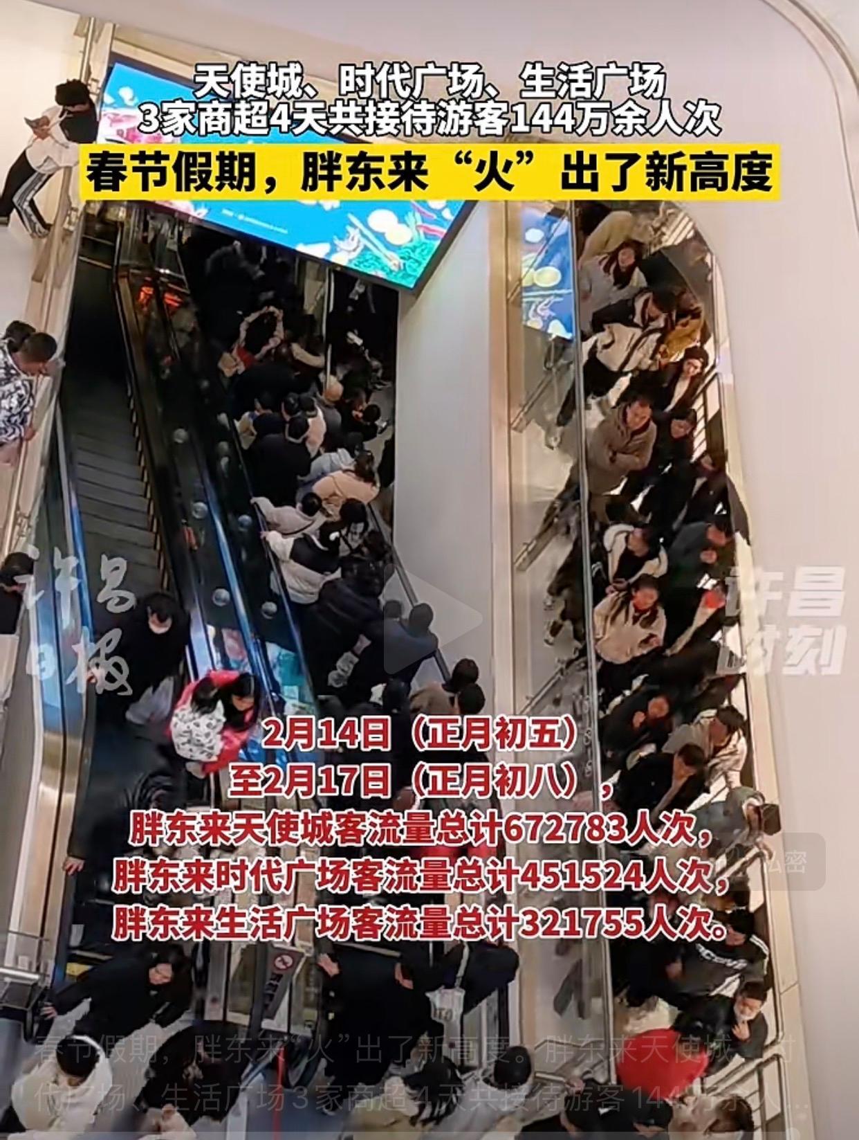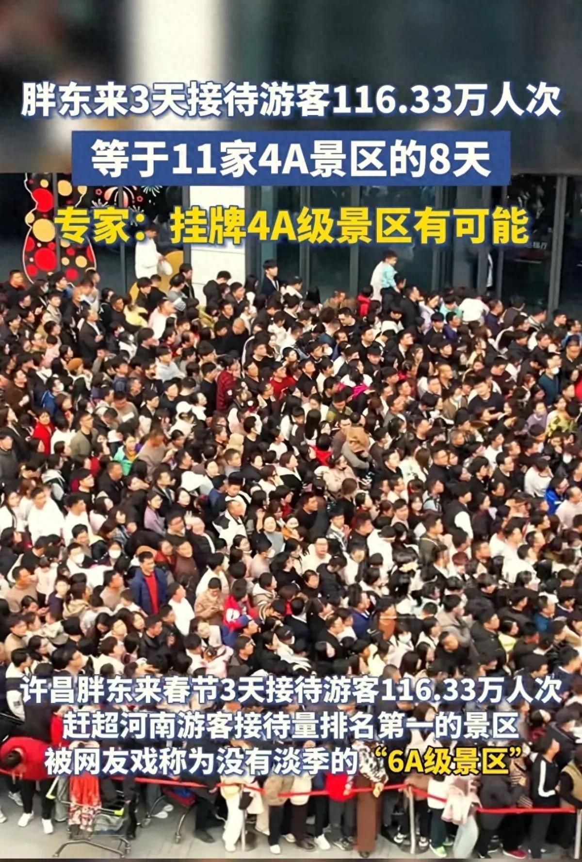 河南許昌胖東來春節假期4天接待遊客144萬人次,遊客主要集中在三個地方(胖東來天使城、時代廣場、生活廣場3家商超),總遊客量超越了河南所有景區躍居榜首,有望成爲一個4a級景區,在網友看來胖東來已經達到了6A級景區服務和人流量啦,胖東來可能變成下一個文和友,遊客到許昌旅遊必打卡景點。