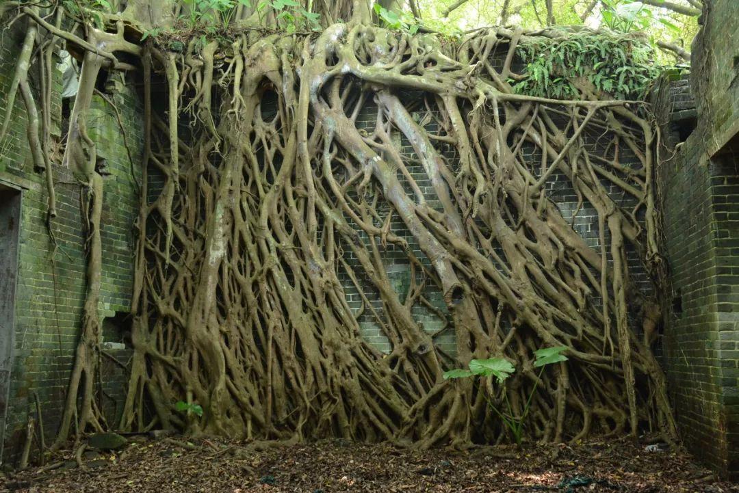 兩條樹根已經代替了原有的房門,成爲自然的門框,只有疲憊不堪的牆體仍在作着頑強的抵抗。