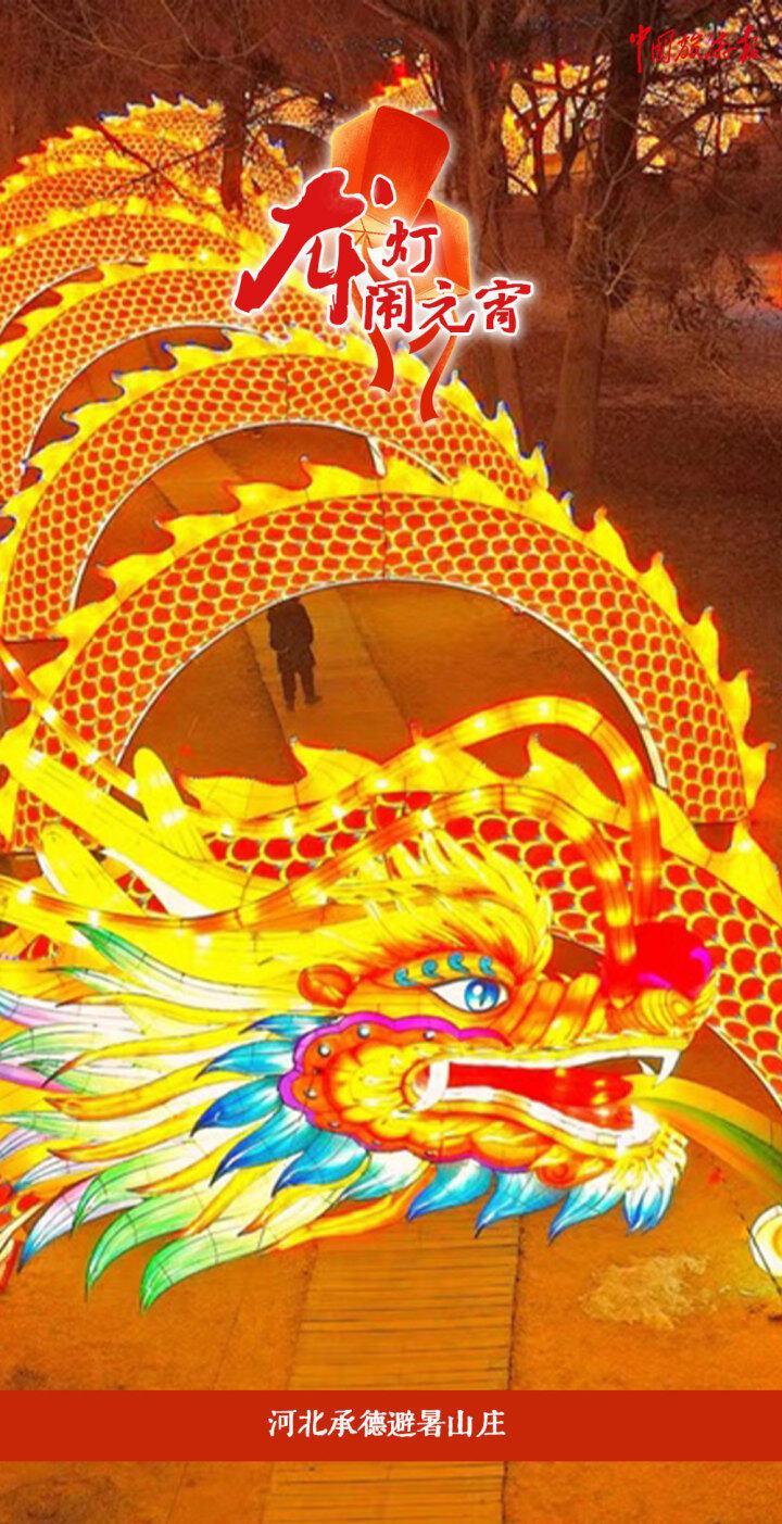 “盛世山莊”故宮·避暑山莊新春宮燈展由承德市文物局與故宮博物院聯合主辦,其中,“祥龍納福”展區佈置了50個龍形拱門,形成了全長500米的龍道。