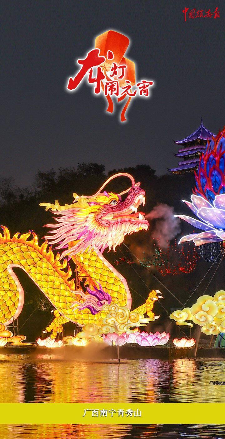 2024年青秀山新春燈會以“壯美廣西 燈耀邕城”爲主題,除了陸地燈組、水域燈組,還有無人機表演,實現了水陸空全覆蓋。