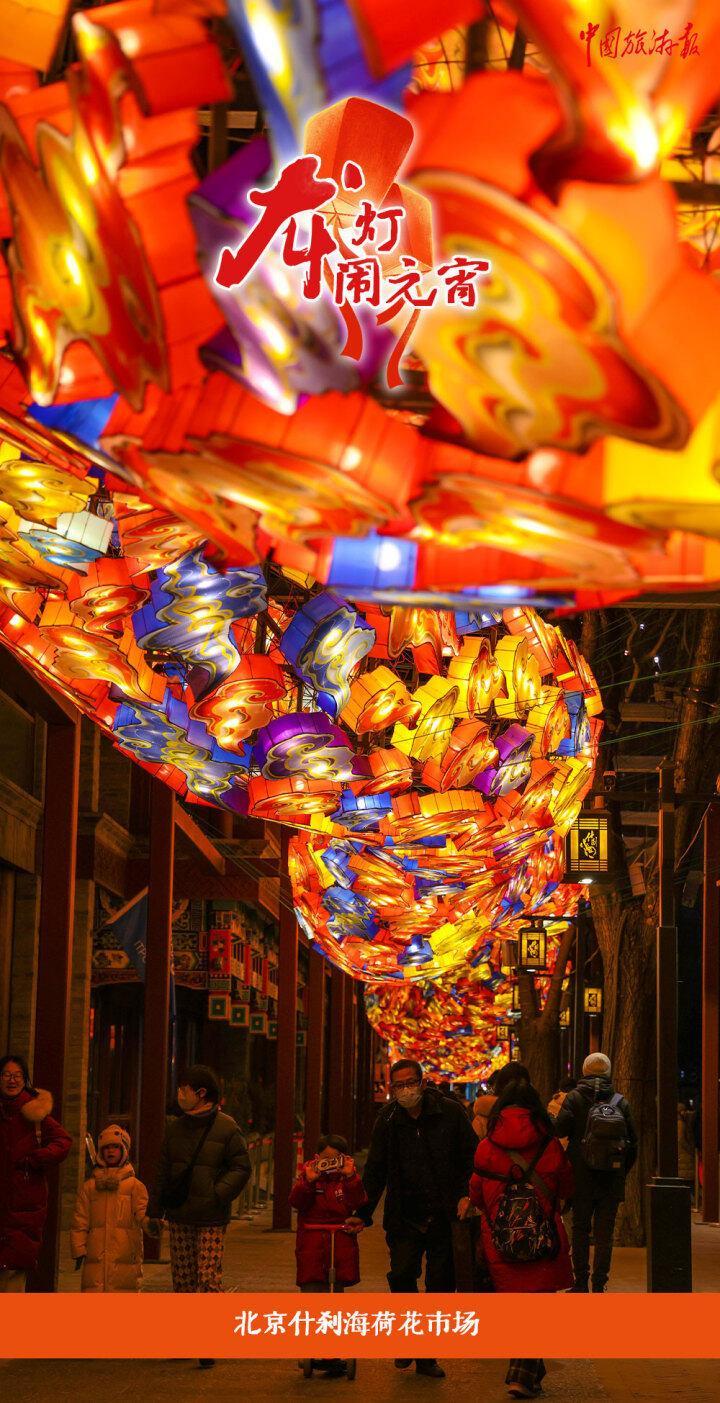 什剎海荷花市場的“蛟龍出海”巨型龍燈長202.4米,寓意“2024龍騰四海”。龍身由上千朵彩色“祥雲燈”組合而成,穿越整條街道。