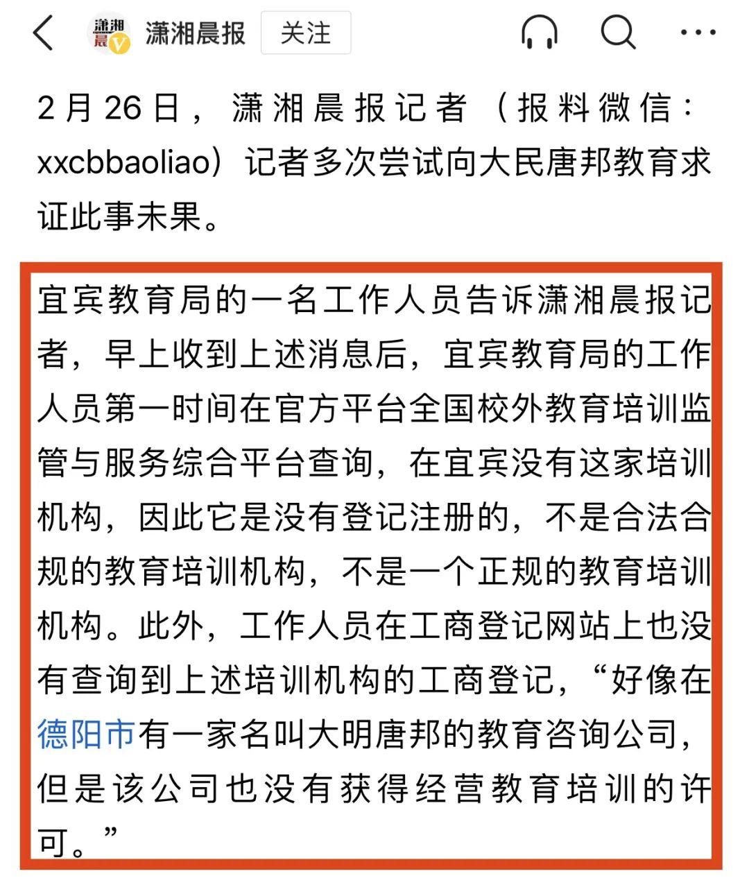 2、然而《瀟湘晨報》採訪宜賓教育局相關工作人員,對方稱宜賓沒有這家叫(大民唐邦的培訓機構),但是網上也查不到這家培訓機構任何資料,是一個沒有登記註冊培訓機構,它經營是不合法的,工作人員說有家叫(大民唐邦教育諮詢公司),但是公司沒有獲得培訓許可認證。