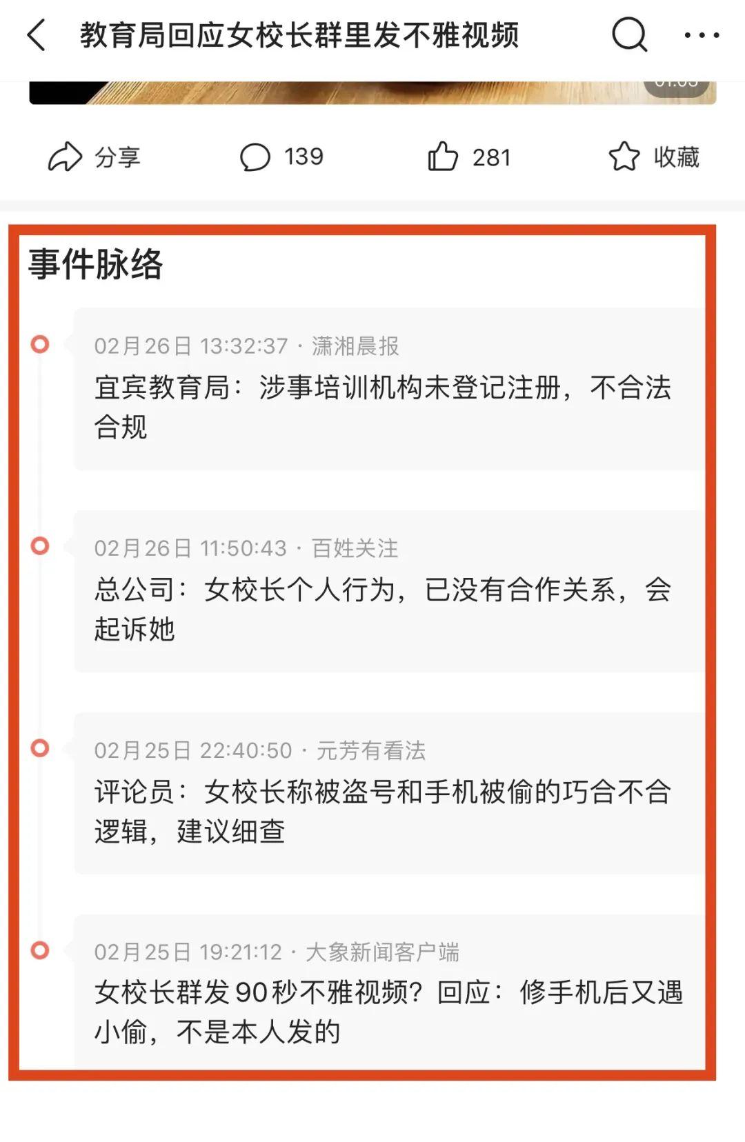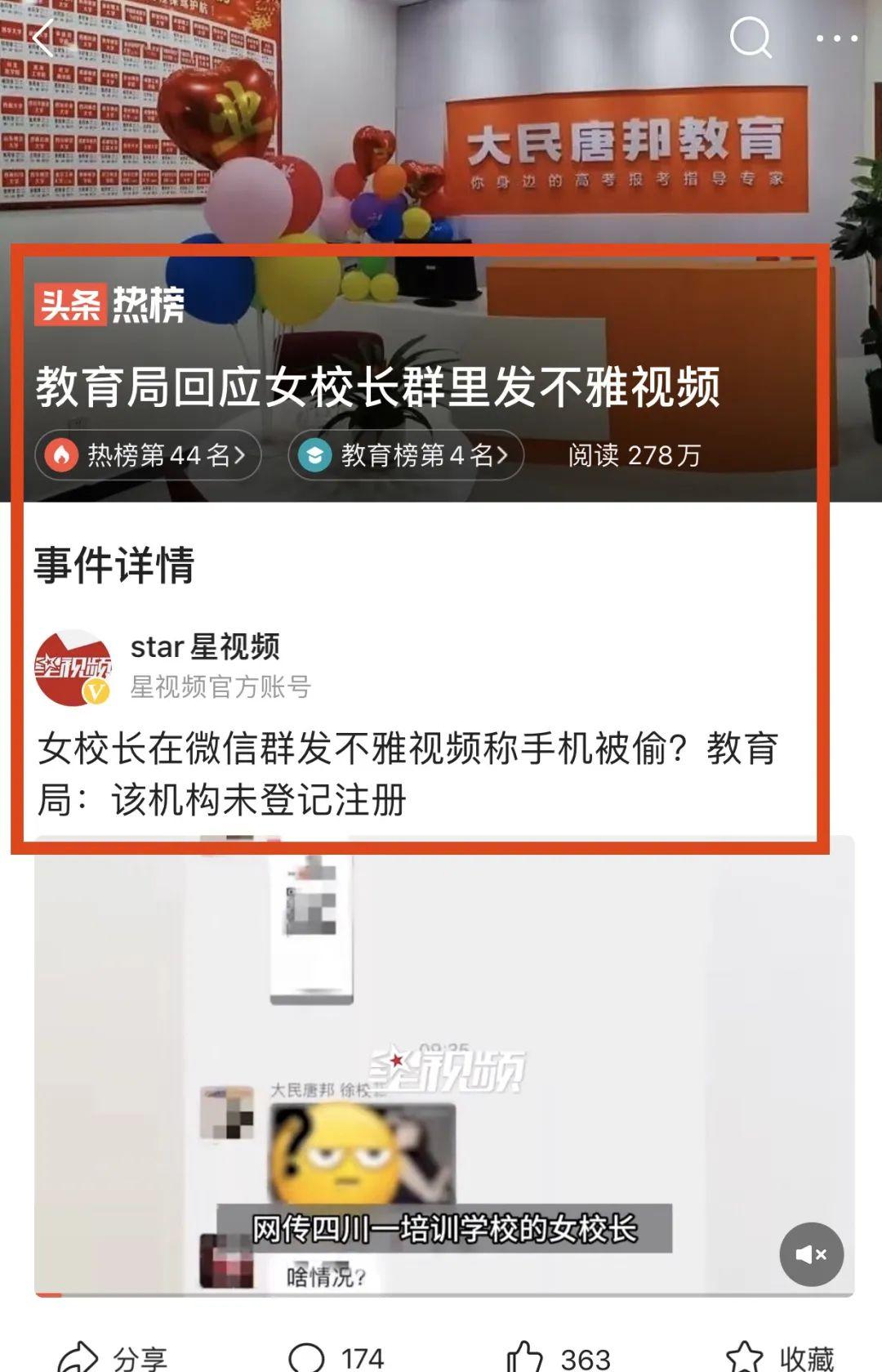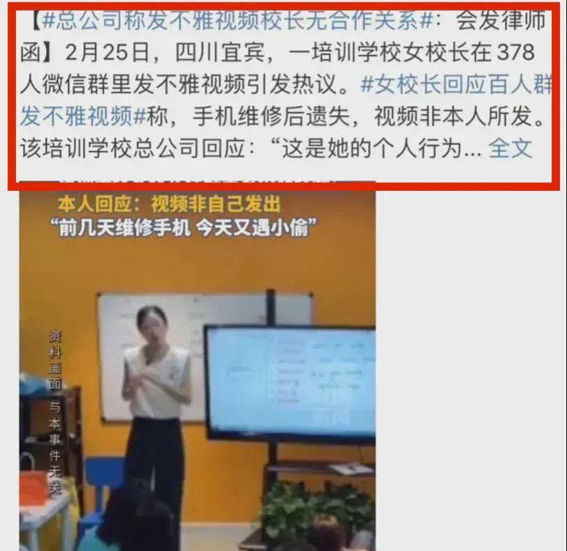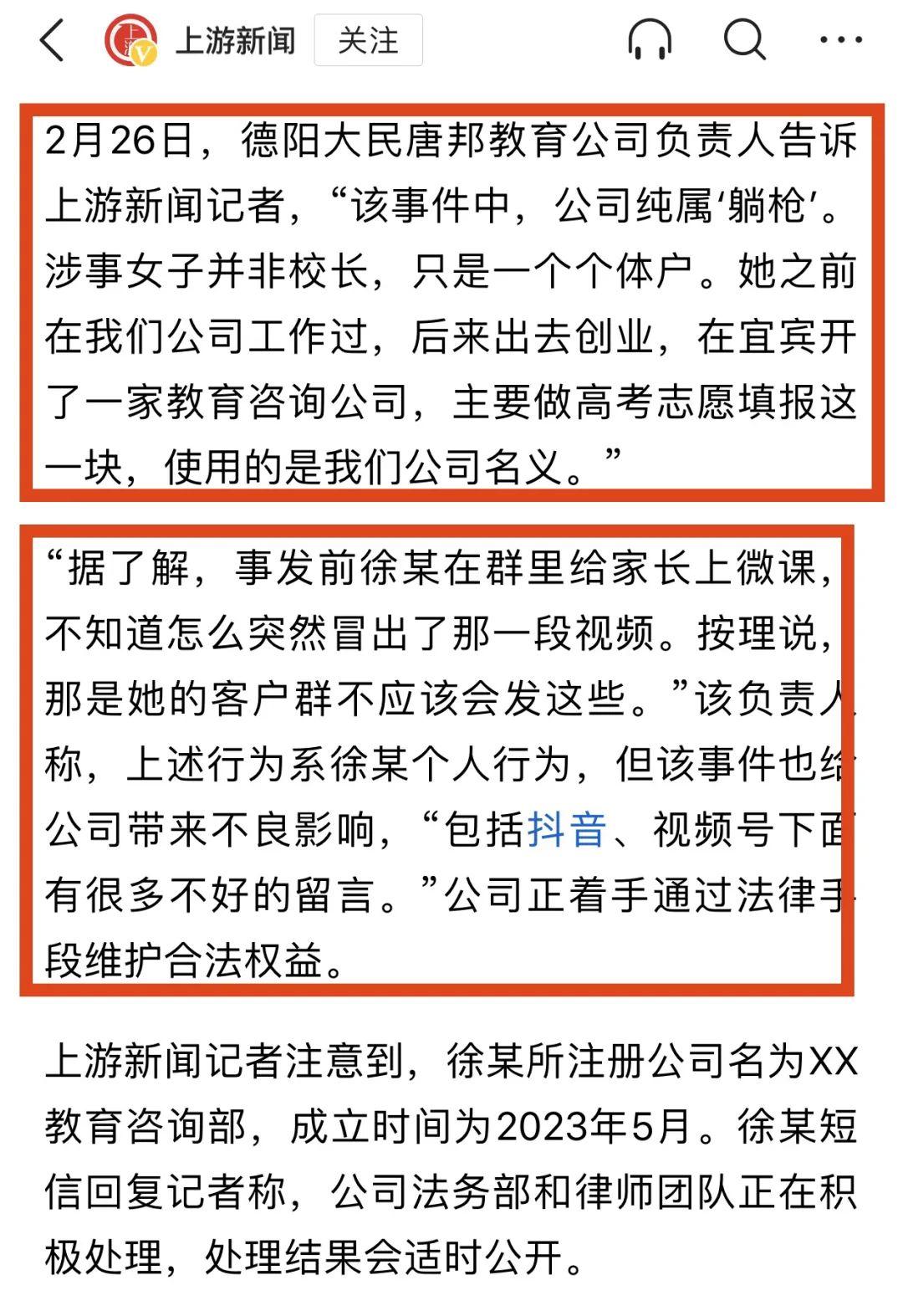 【5】對於女校長羣裏發不雅視頻現在官方有兩個解釋:1、(德陽大民唐邦教育公司)負責人對外界表示,他們公司這次是躺槍,涉事徐校長並非校長,以前在這家培訓機構工作過,離職之後,徐校長開了一家教育諮詢公司,主要服務對象是高考志願者填報,徐校長開了教育諮詢公司名字還是掛着(大民唐邦)公司名字,徐校長髮視頻到微信羣裏,是因爲她當時正在微信羣裏給家長上課,目前視頻輿論已經侵犯了(德陽大民唐邦教育公司)名譽權,以及網友一些不友好的評論,公司目前準備走法律程序維護公司合法權益,(網友猜測可能徐校長面臨起訴、喫官司)。