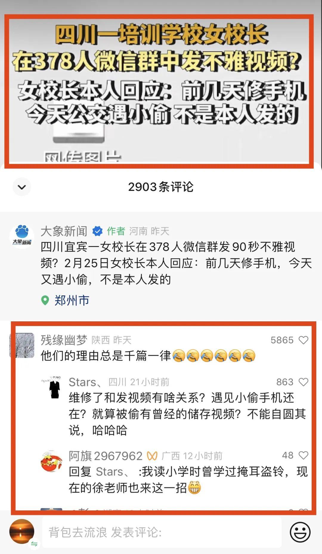 【4】面對徐校長的解釋,網友們不太買賬,看看網友的看法:1、網友(而非已)說:還小偷一個清白。2、他們的理由總是千篇一律。3、維修了和發視頻有啥關係?遇見小偷手機還在?就算被偷有曾經的儲存視頻?不能自圓其說,哈哈哈。4、我讀小學時曾學過掩耳盜鈴,現在的徐老師也來這一招。5、呵呵,是不是本人發的,重要嗎?