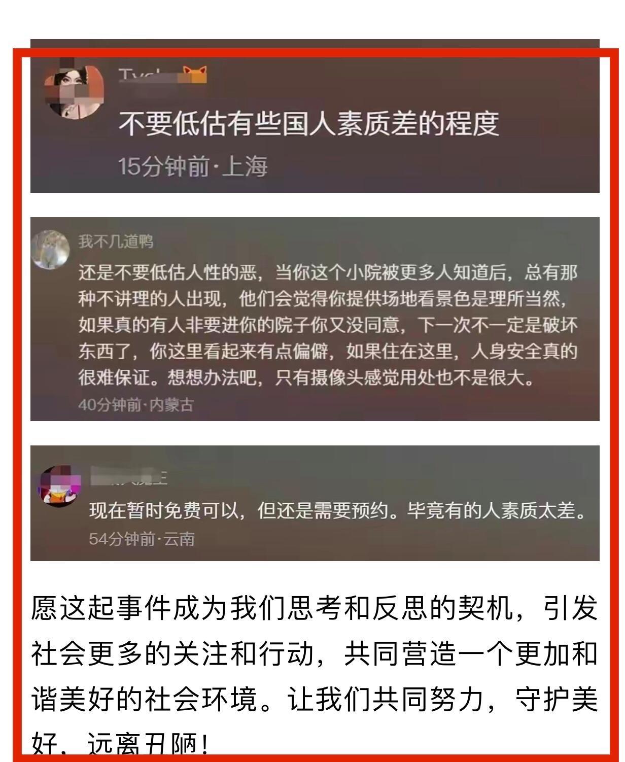 但是網友們建議小院主人適當收取一定門票或者指定物品設施賠償或規則,否則免費的東西一些素質低下游客惡意破壞,之前看到一個大理網紅民宿天台打卡地就是收取門票的。
