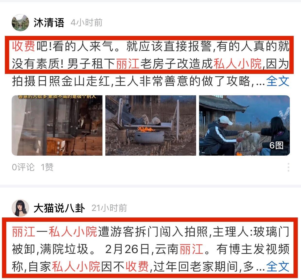 然而免費的東西總是考驗人性的底線,這位小院主人春節回老家過年,然而小院就被一些無素質的遊客糟蹋成一片狼藉,踢傷狗狗、把木柵欄踩壞、把躺椅弄壞,垃圾遍地,小院主人朋友私信給他小院被遊客破壞,遠在老家過春節主人,一時趕不回來,叫朋友填上警示標語,切莫進入私人宅院,但是面對警示標語遊客視若空氣,繼續踩踏,當小院主人過完年趕回麗江,看到自己小院環境被糟蹋不成樣,已經哭成淚人,由於沒有監控也無法提供證據報警,目前就是暫停接待遊客參觀打卡。