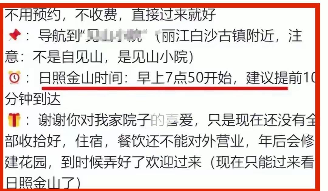 這兩位文藝青年一手打造的詩和遠方小院,在23年一個冬天,持續分享一個月玉龍雪山日照金山的美景在網絡上走紅,一些網友看了被美景感動,聯繫小院主人前往打卡,博主表示不收費、並提供觀景臺、一些很講究的遊客還會帶禮物給遊客,主人很感動,聲稱這屆遊客素質高,最高峯時候有200多人觀看日照金山,在清晨玉龍雪山腳下寒風中燃起篝火一起欣賞日照金山,一起圍着篝火跳舞,多麼幸福時光,這是比花了上百元門票景區還值得,遊客感覺很值得,小院主人也感覺一切努力付出都是值得呢。