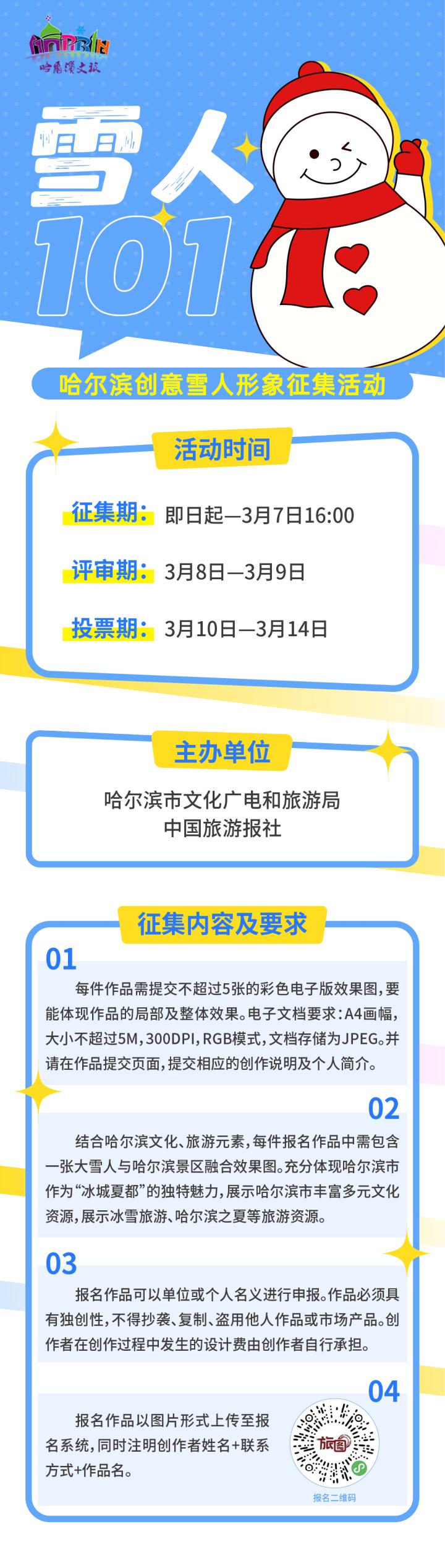2.結合哈爾濱文化、旅遊元素,每件報名作品中須包含一張大雪人與哈爾濱景區融合效果圖。充分體現哈爾濱市作爲“冰城夏都”的獨特魅力,展示哈爾濱市豐富多元文化資源,展示冰雪旅遊、哈爾濱之夏等旅遊資源。