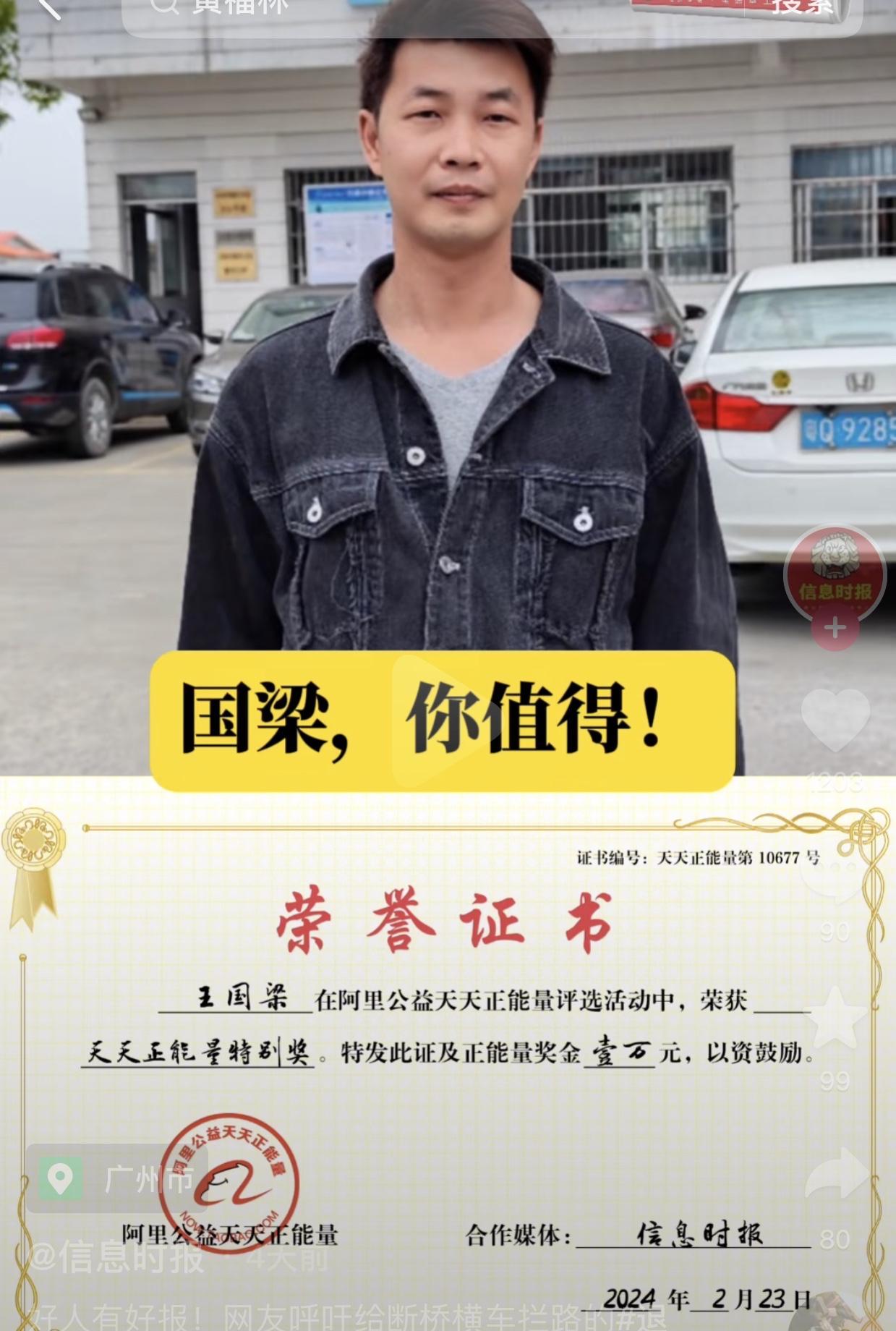 事後王國樑接受採訪表示,如果沒有那位摩托車大哥黃福林,他說肯定大家看不到他了,因爲不瞭解情況,肯定衝下去了,如今王國樑也得到了好人正能量獎10000元,王國樑舉動和反應,他是一位退伍軍人,一位黨員,這次充分體現了一位退伍軍人退伍不褪色,在王國樑身上表現得淋漓盡致。