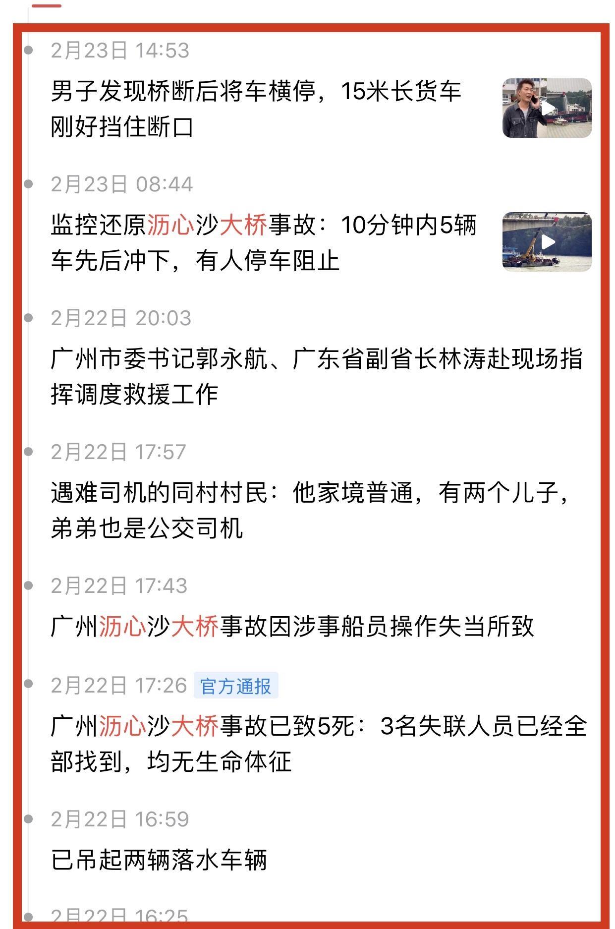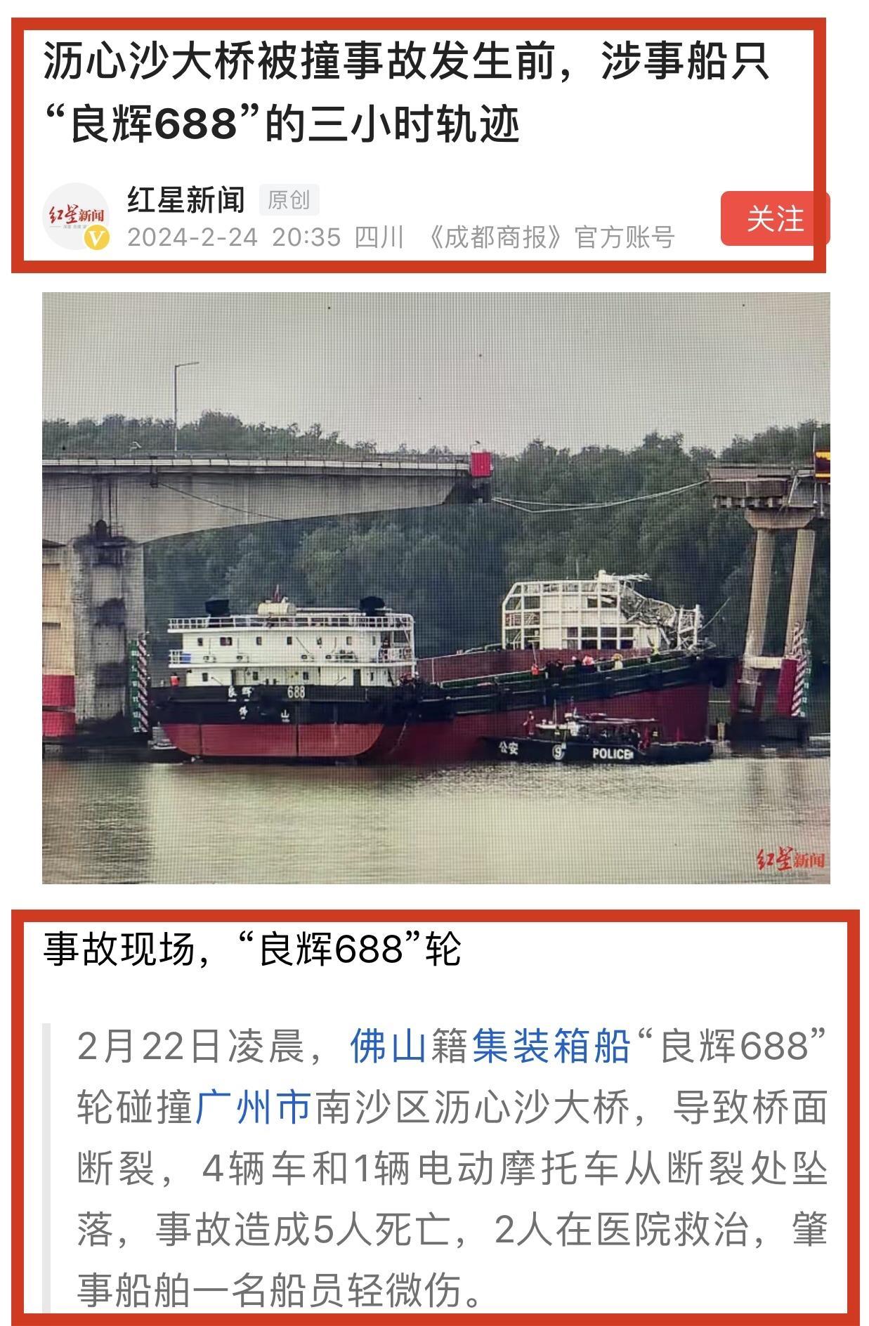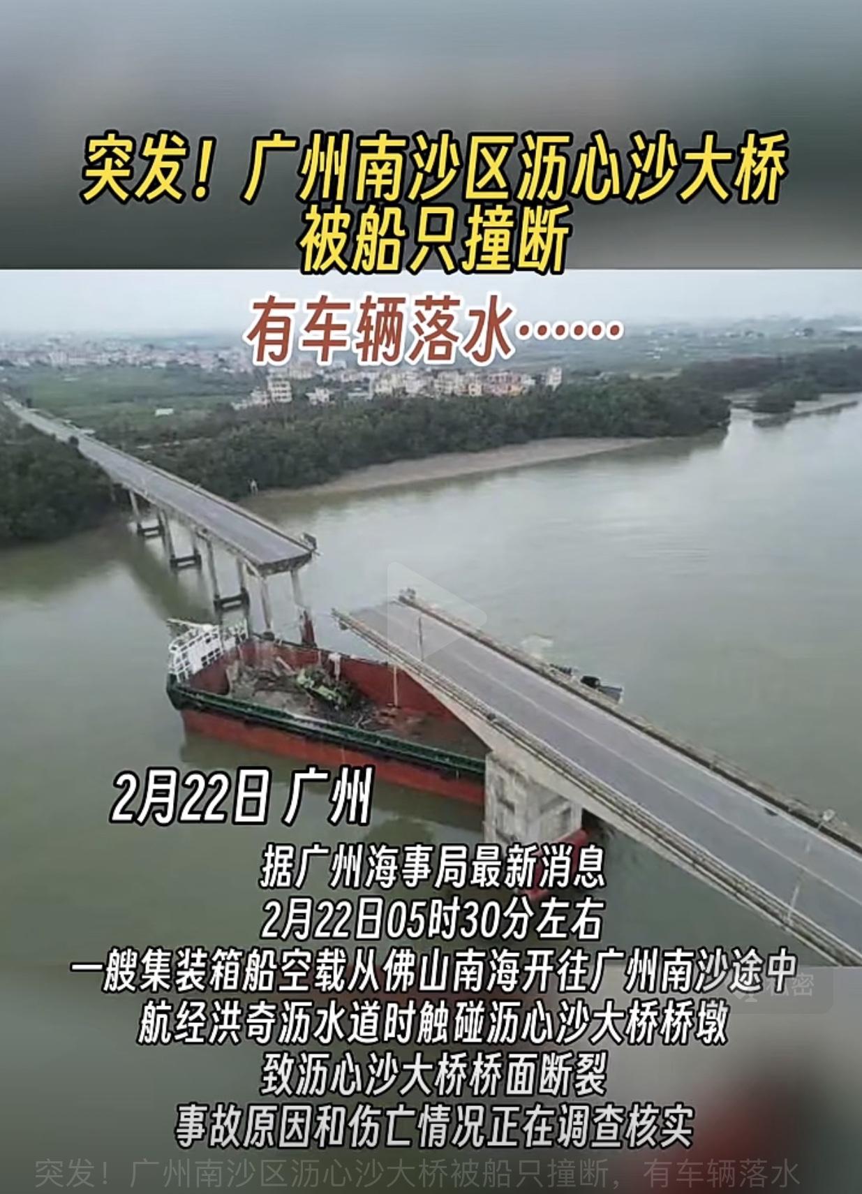 2月22日早晨醒來拿起手機各個平臺熱搜,朋友圈、微信羣都是斷橋新聞,2024年2月22日凌晨5點多,發生在廣州南沙區三民島,一艘集裝箱船名爲(良輝688)空載從佛山南海開往廣州南沙途中,航經洪奇瀝水道時觸碰瀝心沙大橋橋墩,致瀝心沙大橋橋面斷裂,事發已經快過去一個星期,根據官方報道3輛小汽車和一輛電動車、一輛公交車衝下橋,5人遇難,兩人受傷就醫,讓人悲痛,遇難者安息、受傷者早日康復。