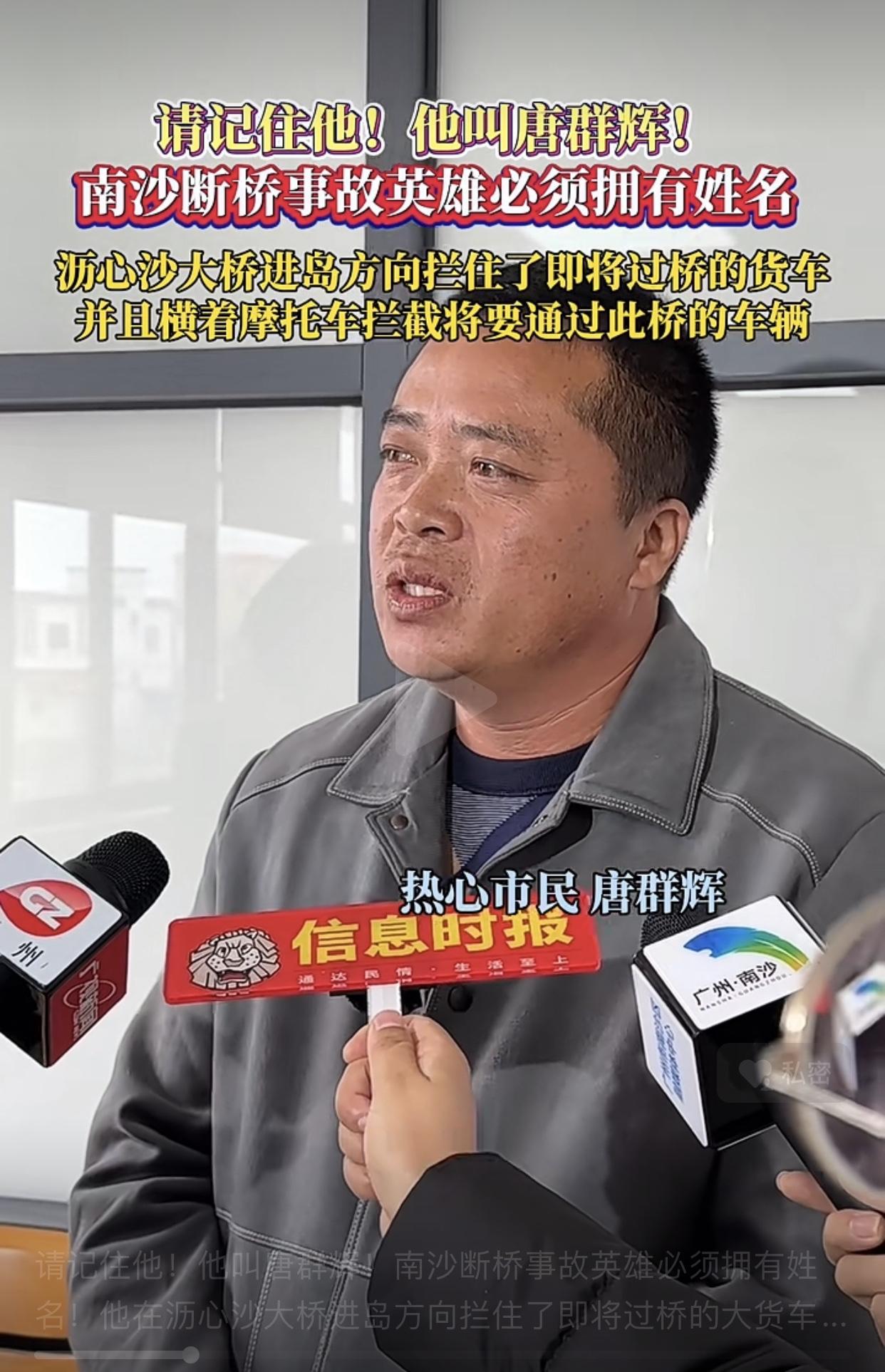 3、唐羣輝,第三位斷橋事故吹哨人,他守在進入三民島的這一頭,他事後講述,他進島時候天沒亮,上橋之後就感覺心裏不安,前面路燈一片漆黑,重來沒有遇到這個情況,他以爲是水管爆了,結果聽到橋對面人喊是橋斷了,他立馬回頭,把車在橋上橫過來,然後不聽按喇叭,阻止上橋車輛前進,不讓悲劇再次發生,他說一輛大貨車衝上來不減速,他不停的呼喊、按喇叭對方纔停下來,他說如果不喊,對方不瞭解情況肯定衝下去了,早晨都是一些大貨車比較早進三民島拉蔬菜水果,直到消防車到來,唐羣輝才離開。
