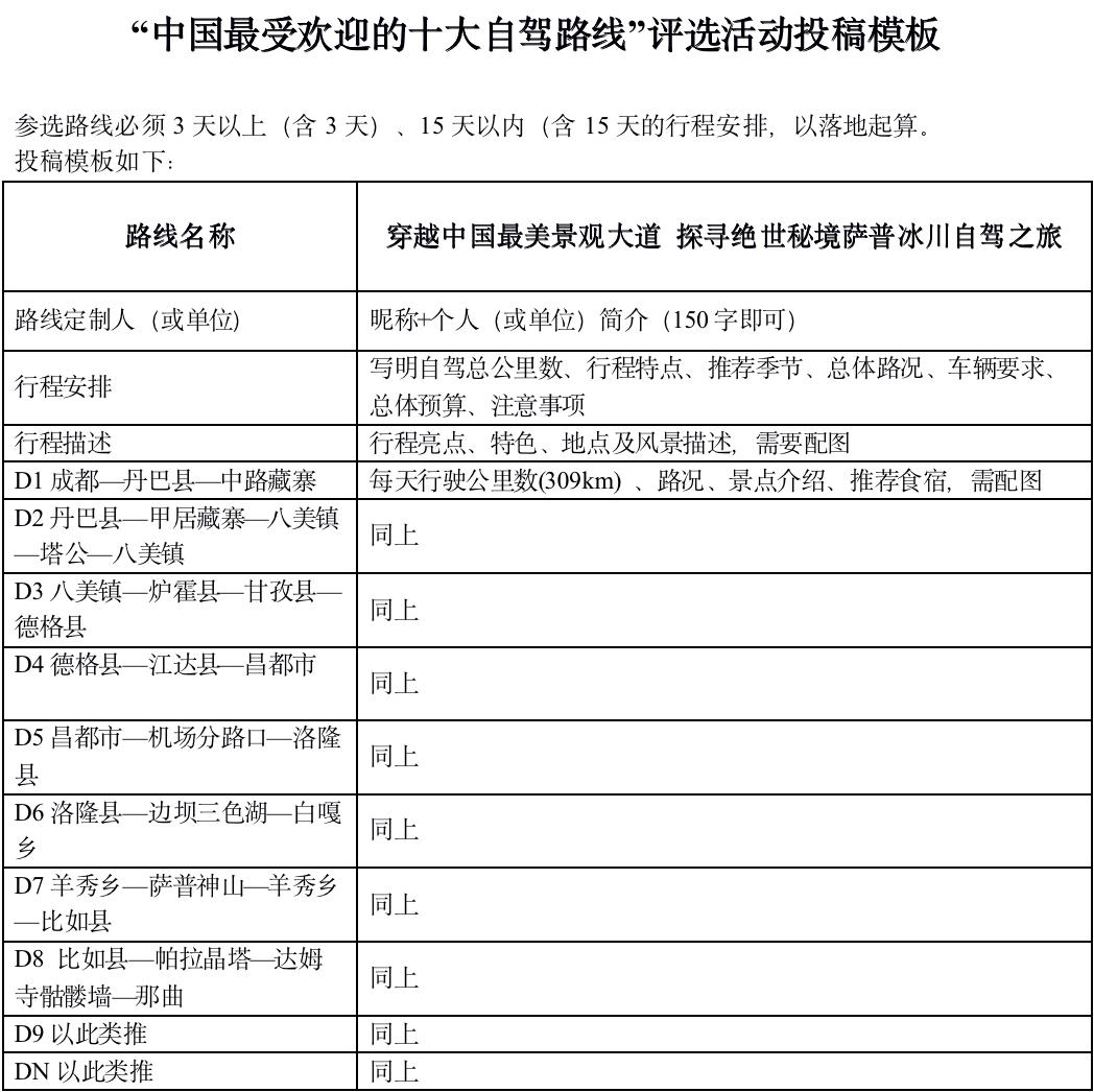 注意:入選“中國深受歡迎的十大自駕路線”獲獎選手免費參加頒獎典禮及承辦地落地自駕體驗活動。