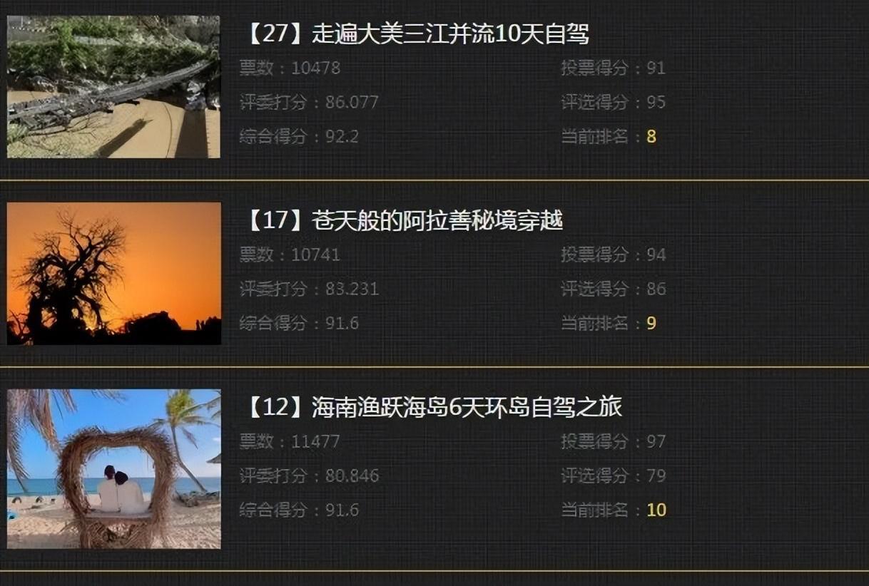 2、2024年4月8日12時正式啓動公開投票環節,由投票系統即時統計得票;參選自駕路線得分(專家評委分30%+網友投票分70%)最高的前10名獲獎;