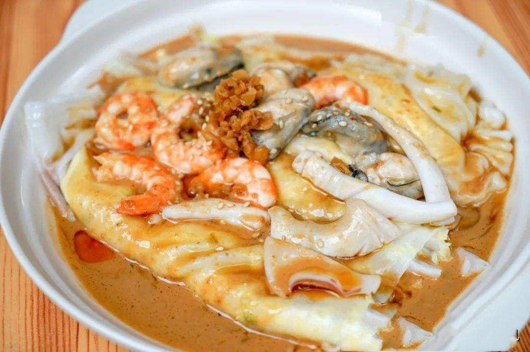 蠔烙煎,以鮮蠔、地瓜粉和鴨蛋爲主,小火慢煎,煎至兩面金黃,口感外酥裏嫩,味道鮮美,是潮州當地人和遊客讚譽最高的街頭小喫。