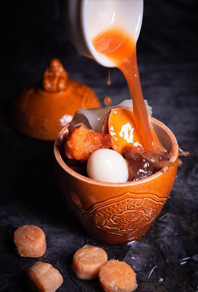 佛跳牆,被譽爲“閩菜之王,以多種海鮮、肉類等爲主要原料,配以多種調料烹製而成,色澤金黃,味道鮮美,濃郁可口,是福州人民喜愛的美食之一。