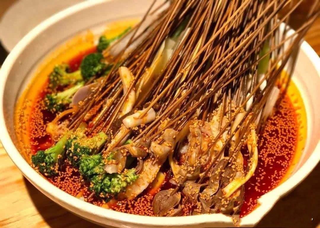 鉢鉢雞,“鉢鉢”其實就是瓦罐,鉢內配以麻辣爲主的佐料,挑選上一大把各種各樣的串串,往陶罐的麻辣味汁裏這麼一涮,味道悠長之外更添情趣盎然。