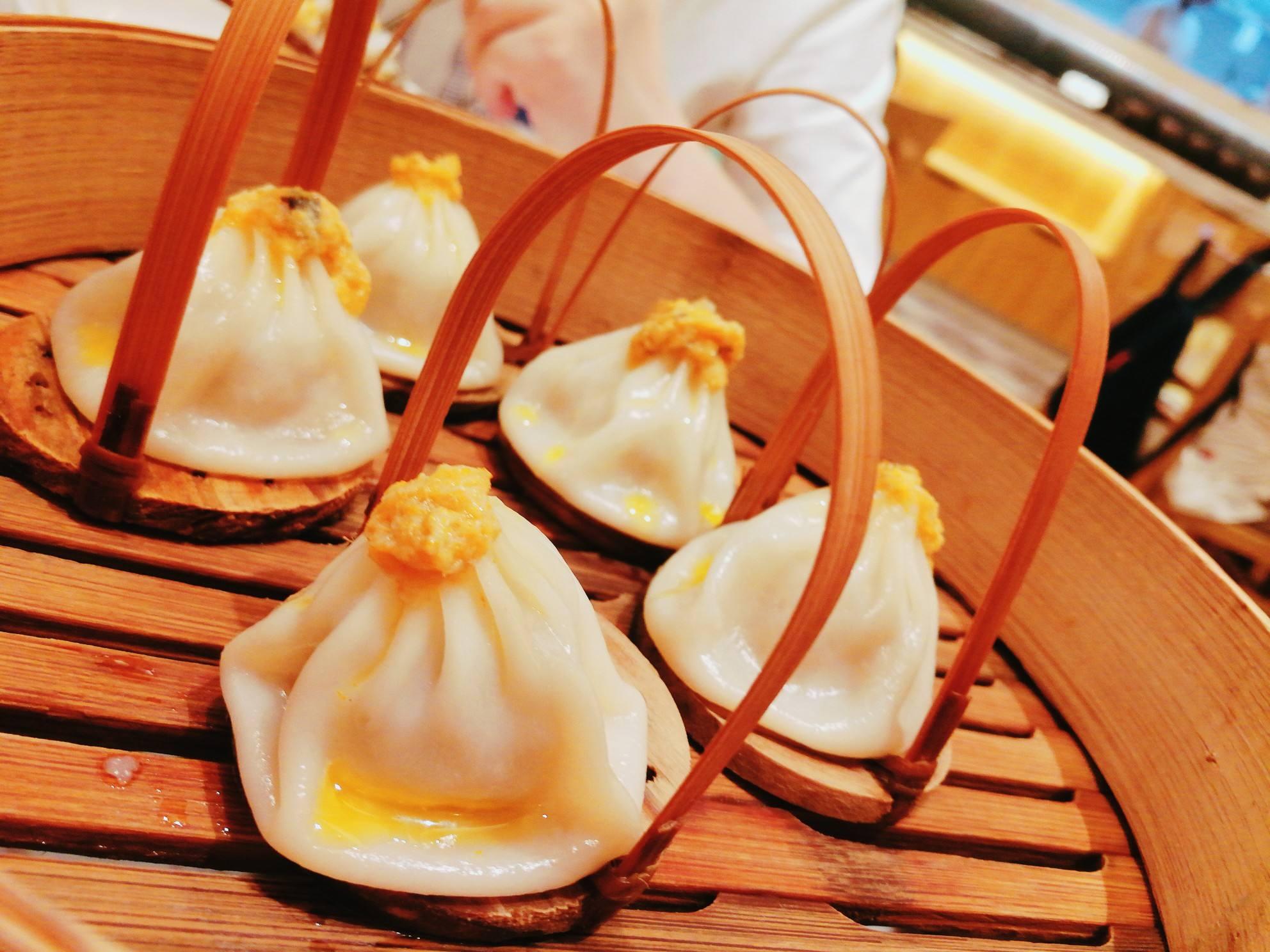 蟹黃湯包,蘇州的傳統小喫之一,將鮮肉和蟹黃混合包在麪皮裏,蒸熟後的湯包外皮白嫩,汁水豐富,非常美味。