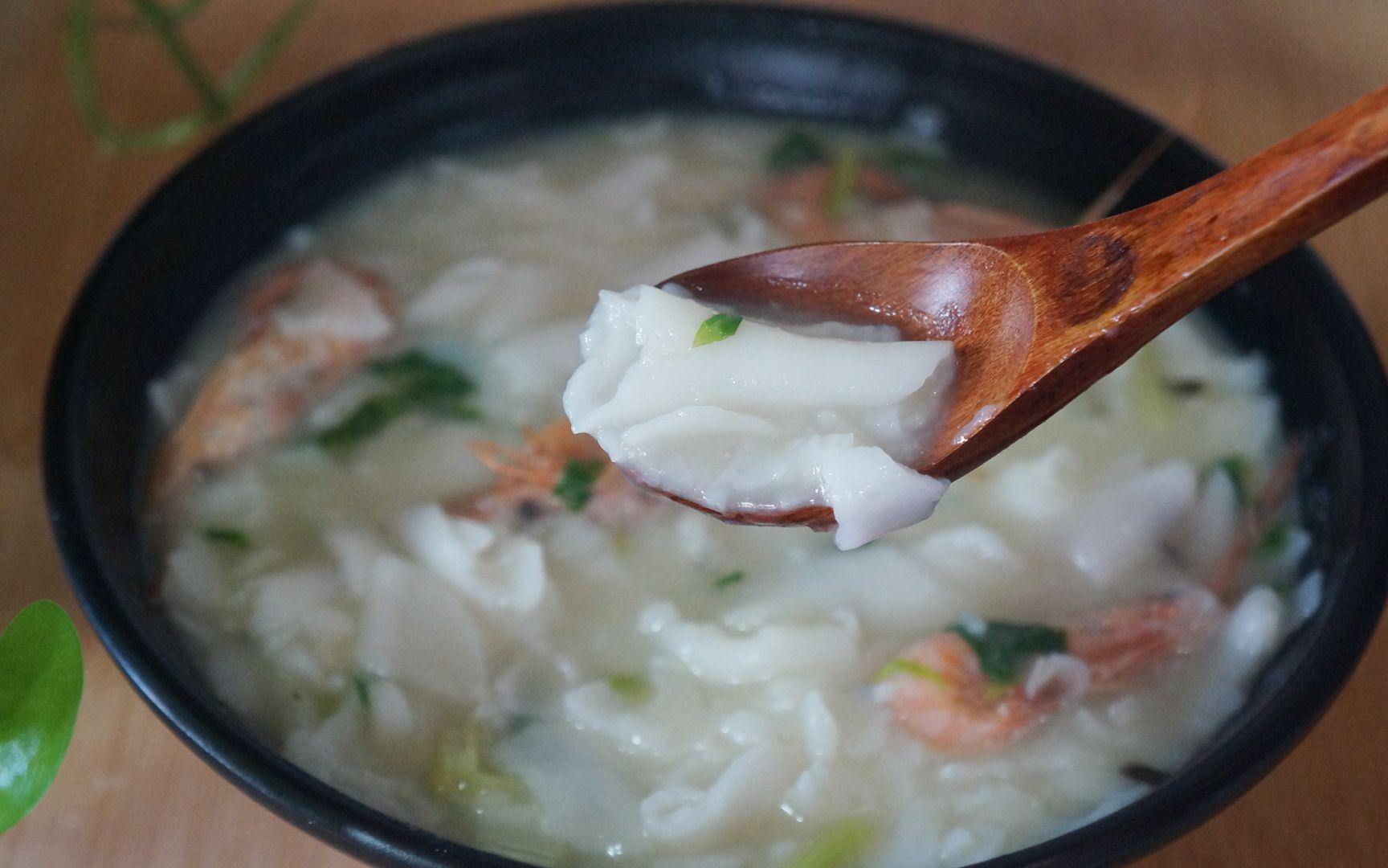 鍋邊糊,以蛤、香菇、蝦米等配料熬成的清湯,搭配軟嫩清香的麪糊,是早餐的佳選。
