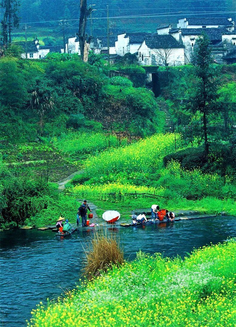 棵棵粉紅的桃花、潔白的梨花點綴在漫山遍野金黃色的油菜花中,掩映着白牆灰瓦的徽派建築,特別是當煙雨朦朧的時候,足以盪滌着心靈。