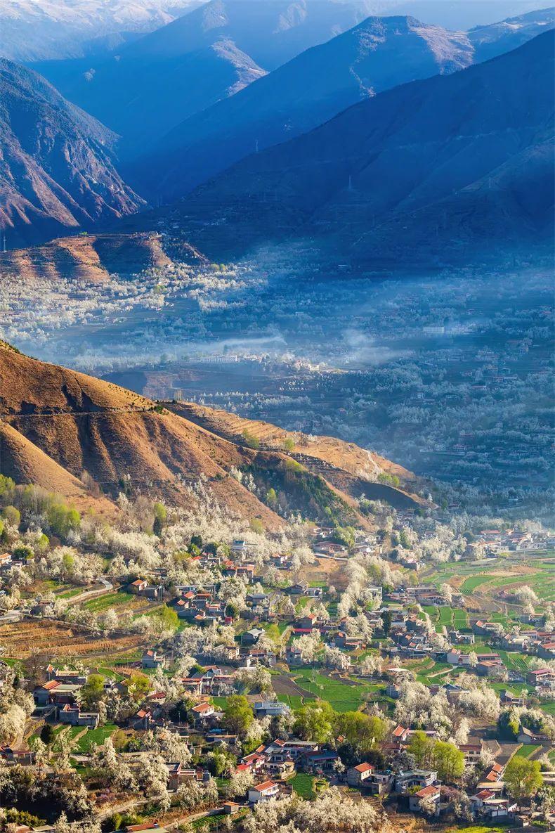 媲美羅平的油菜花,更不輸江南的煙雨桃花,萬畝梨花點綴在山坡上,盛開在碉樓、藏寨間。