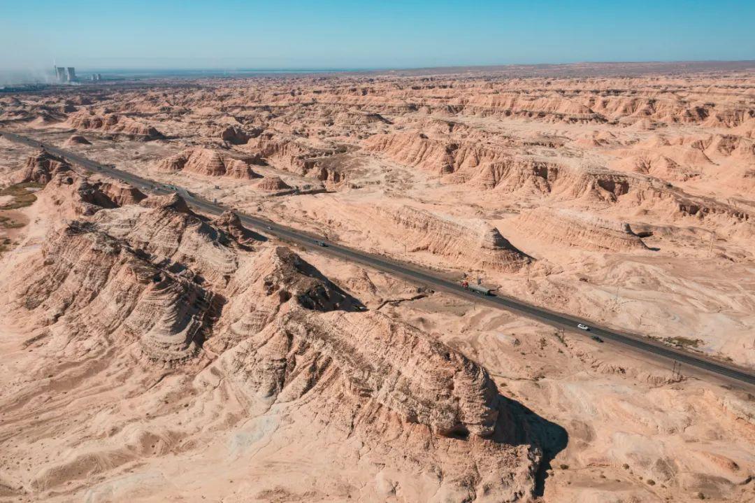 從空中看,沙漠公路像一條遊弋於茫茫沙海的黑色長龍。