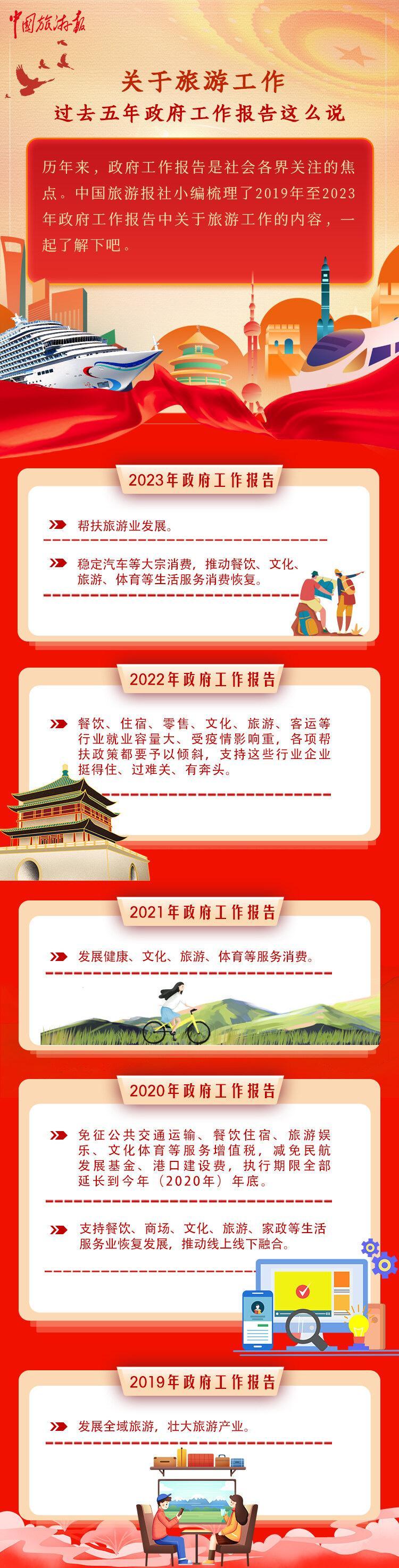 歷年來,政府工作報告是社會各界關注的焦點。中國旅遊報社小編梳理了2019年至2023年政府工作報告中關於旅遊工作的內容,一起了解下吧。