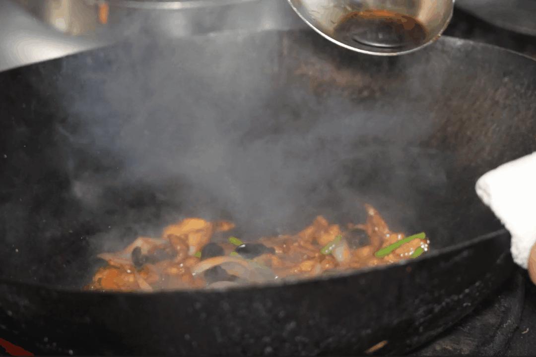 肉片與木耳、玉蘭片、菠菜等翻炒,