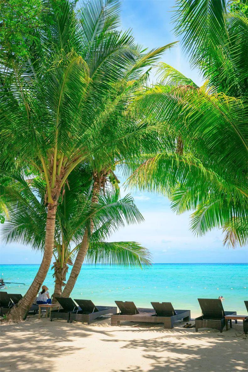 整片茂密的椰林,大片的白色沙灘,