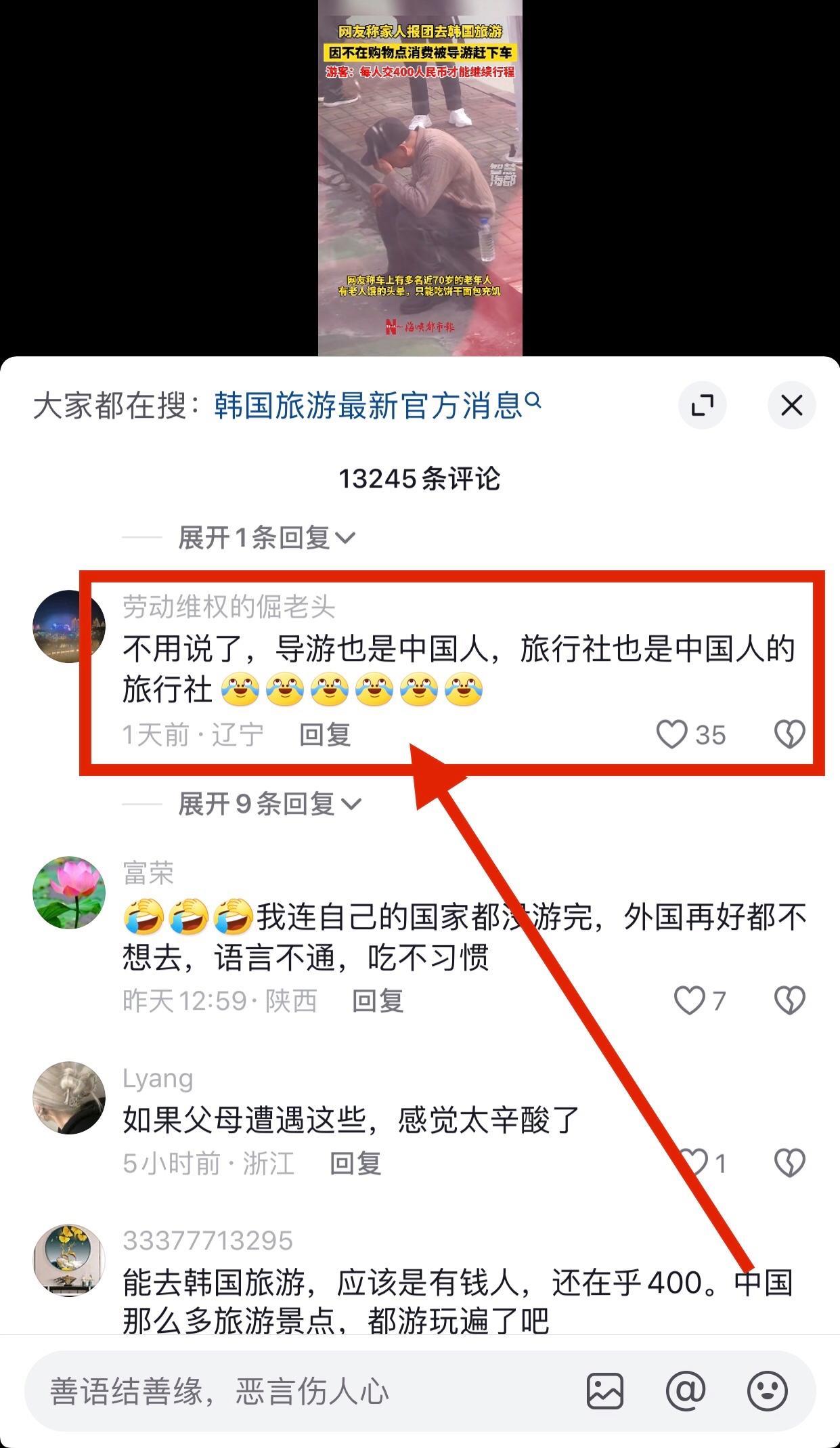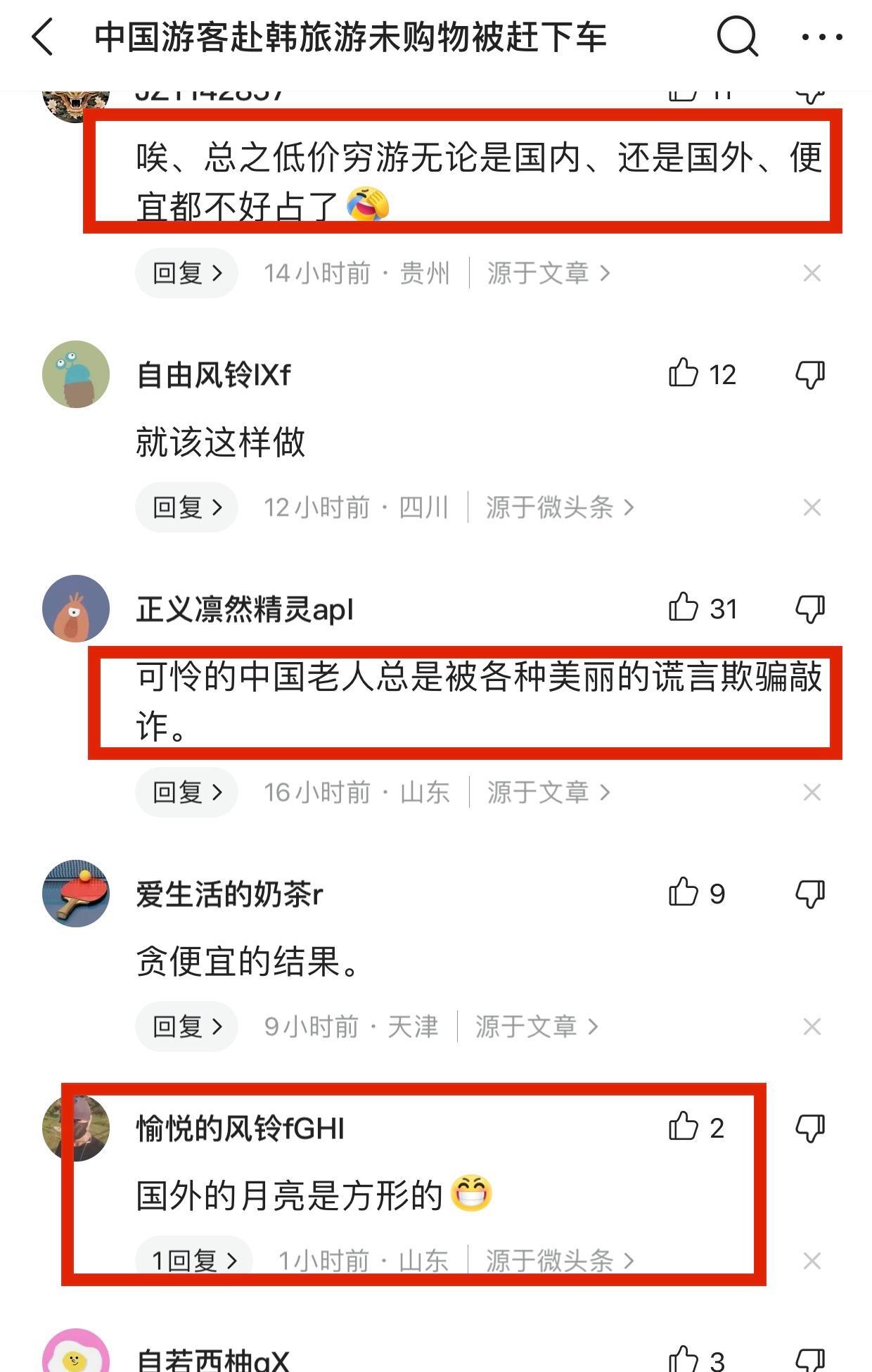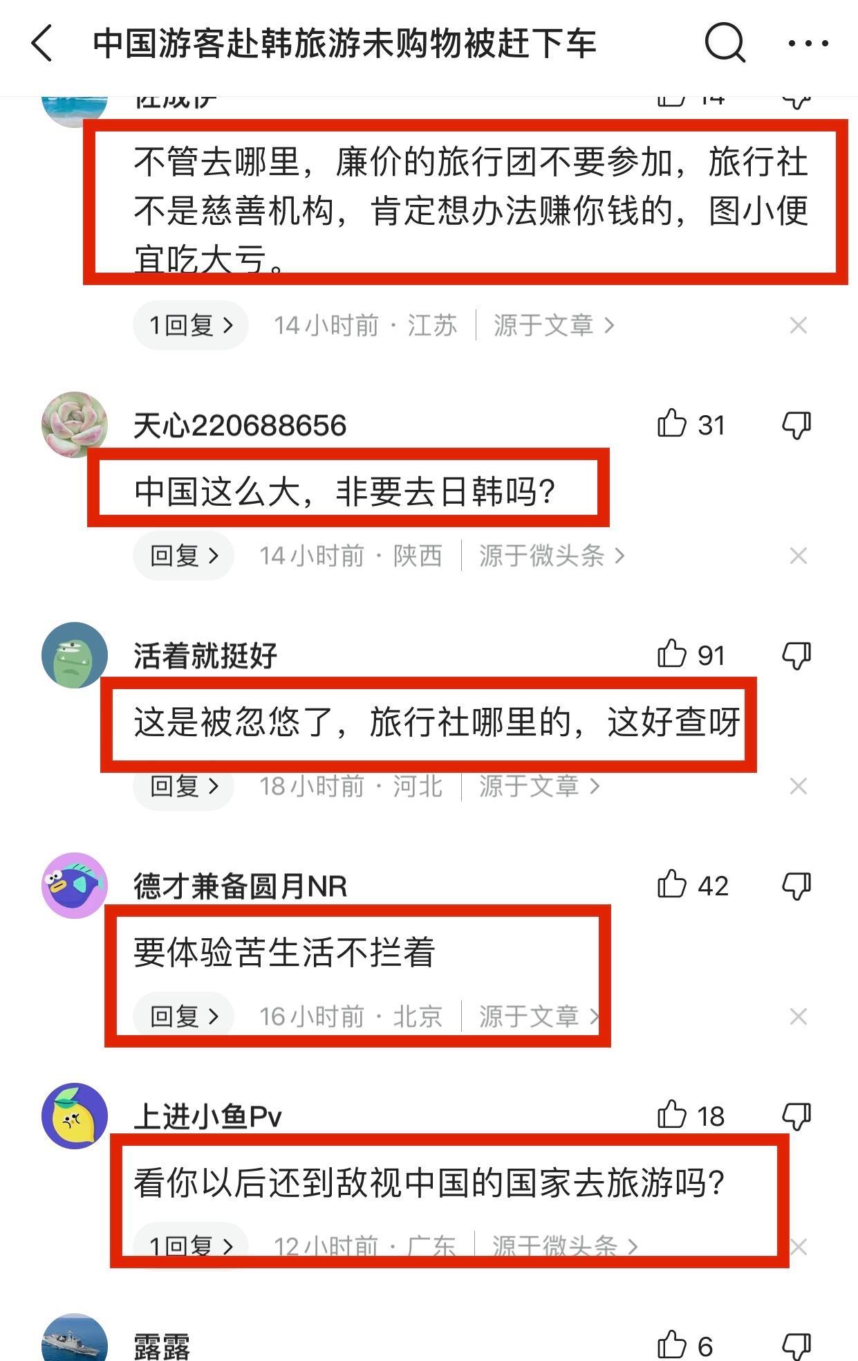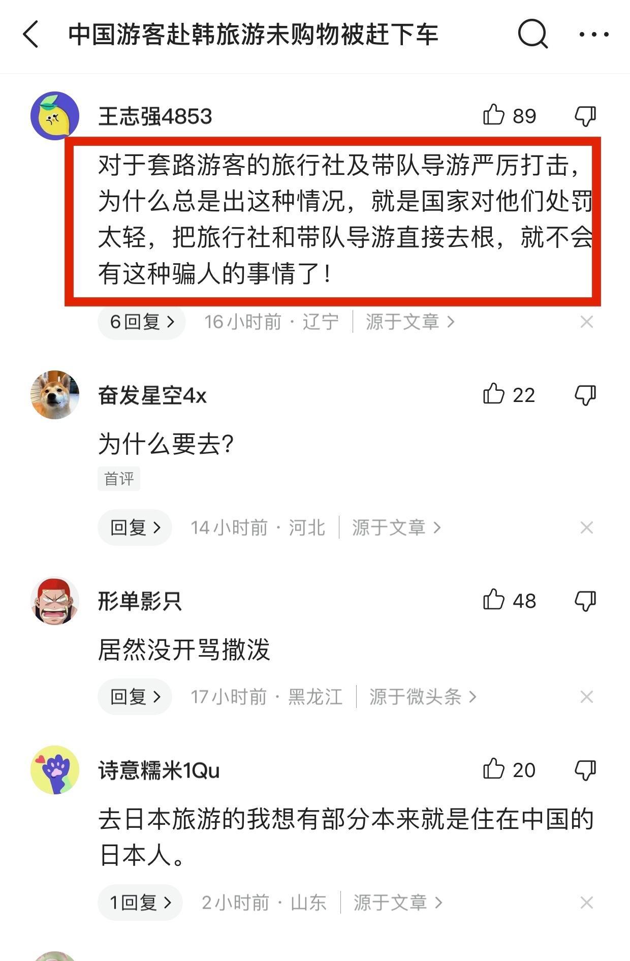 一些網友留言過於極端,指責什麼外面月亮又比咱們月亮圓嗎?跟你去不去韓國旅遊沒有多大關係,這只不過是中國旅行社和導遊換一個地方坑你爹媽跟團遊買東西,網友也認爲這幫中國大爺肯定是在中國旅行社報團、帶隊導遊肯定是中國導遊,如果不從源頭找中國導遊和旅行社麻煩,肯定解決不了問題。