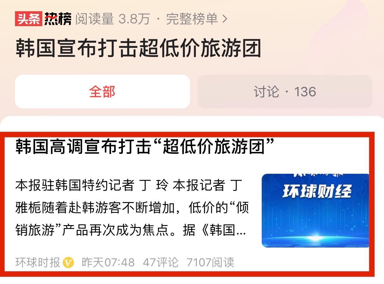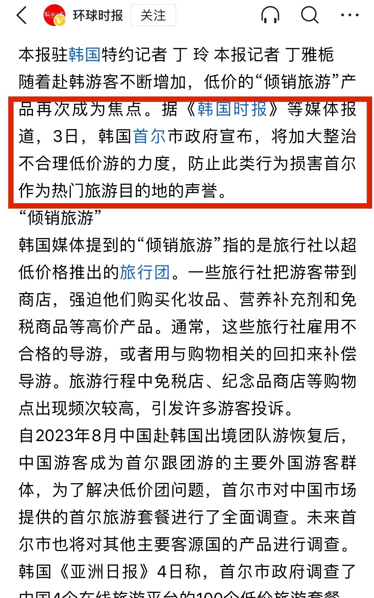 3月5日,環球時報文章指出,韓國官媒3月3日發佈,韓國將加大力度打擊低價旅遊,之前也有多次出現低價旅遊新聞不少,但是這次40名7旬老人跟團遊被購物趕下車,原因有兩點,收客旅行社和帶隊導遊是不是中國的,如果是那麼就是中國導遊和旅行社跟韓國導遊同流合污一起坑40名老年團購物,也應該查一下收團旅行社和帶隊導遊。