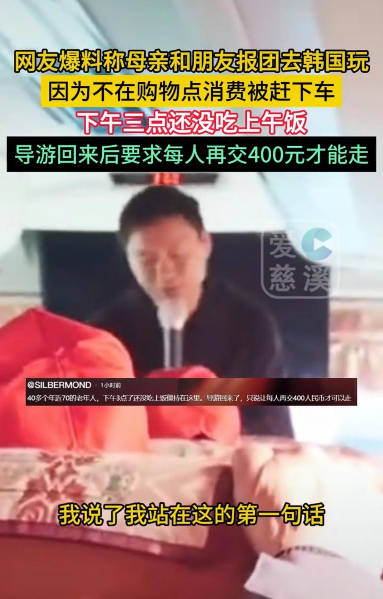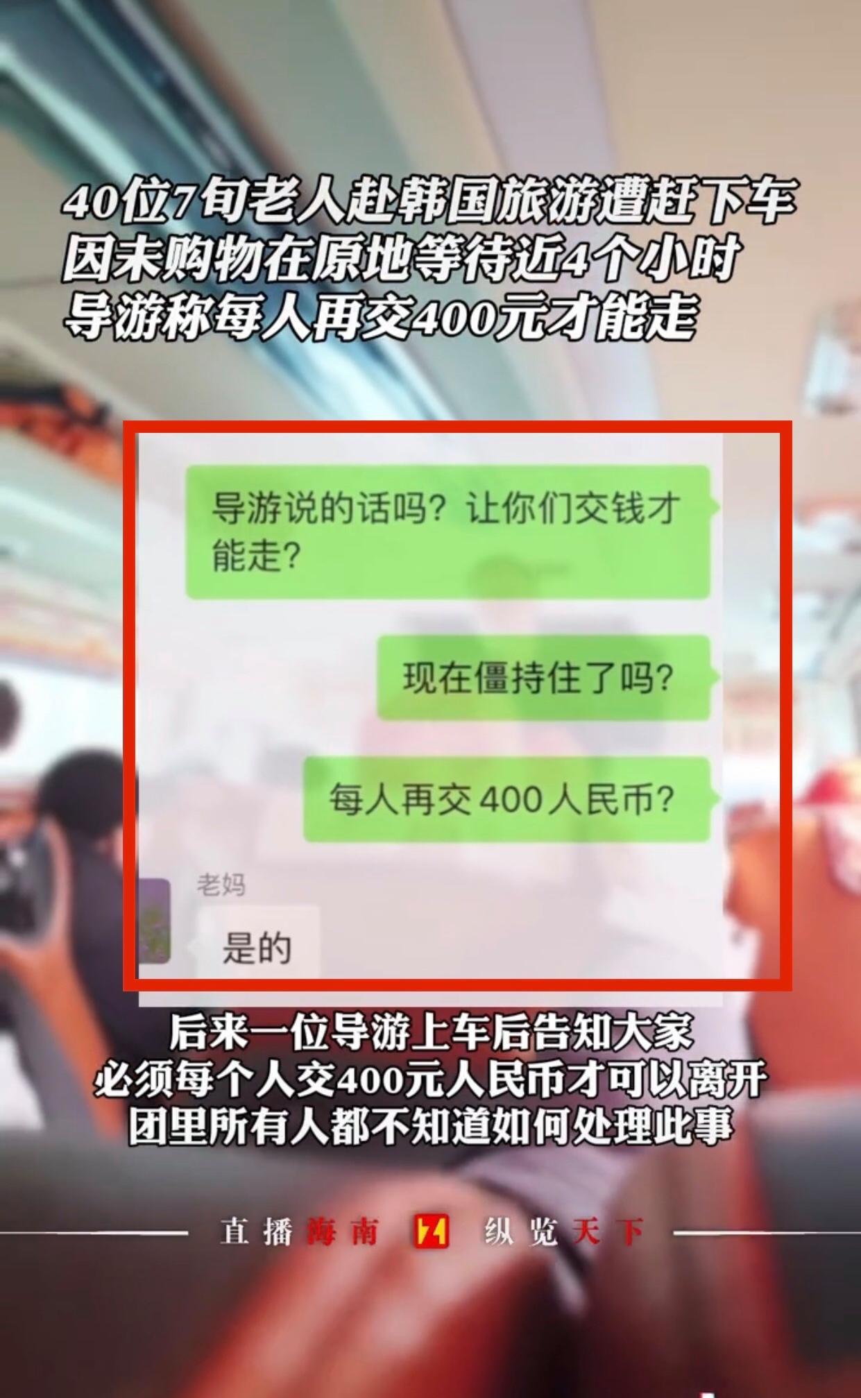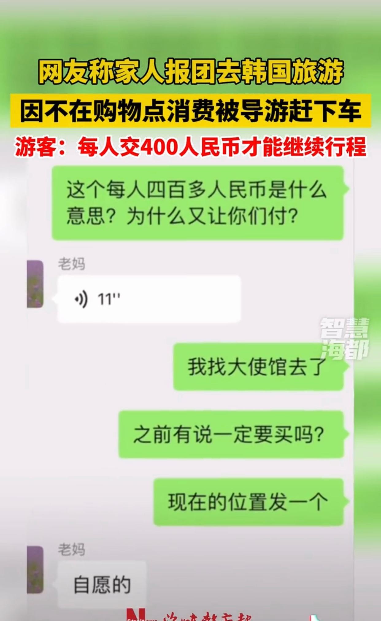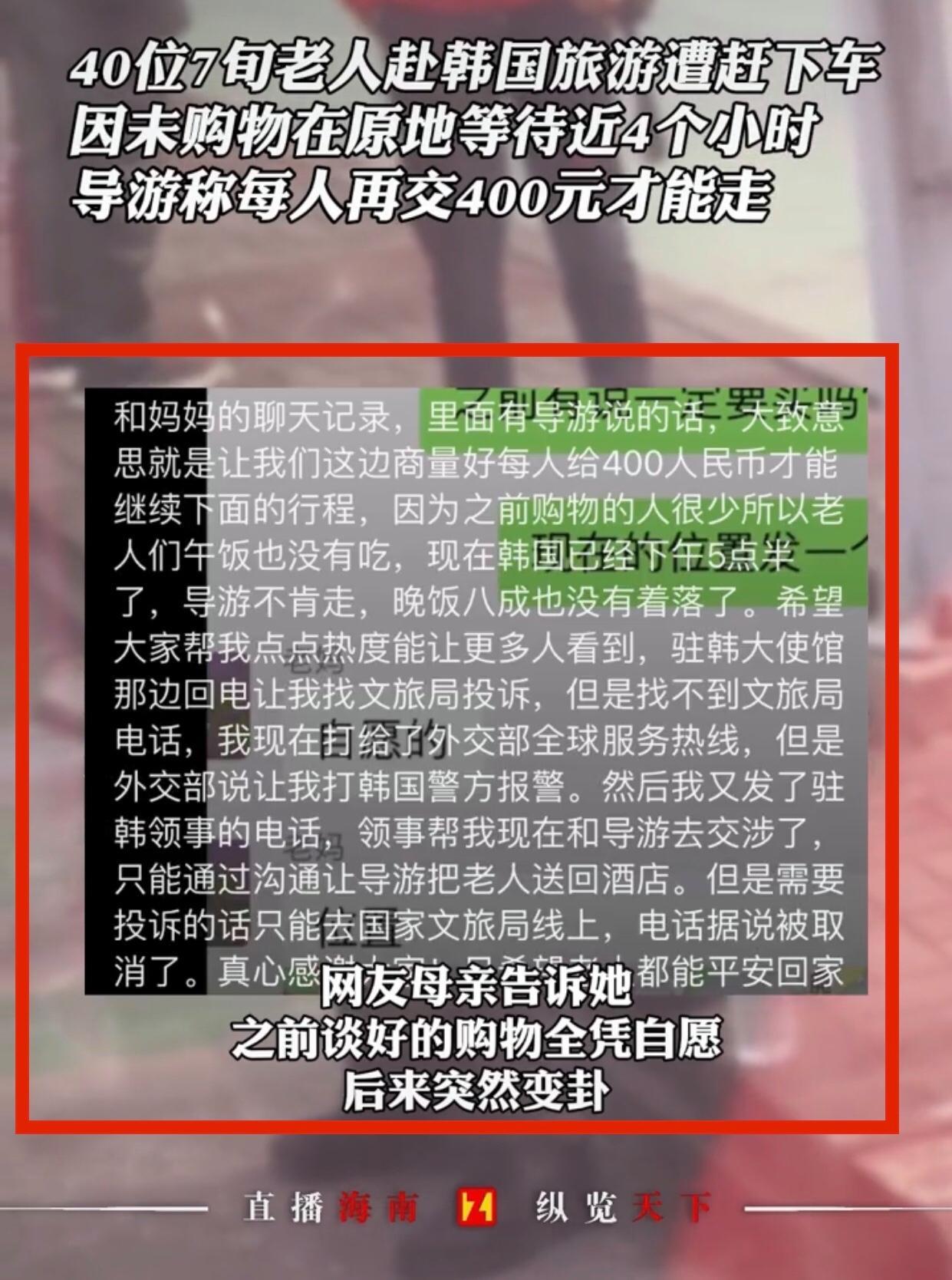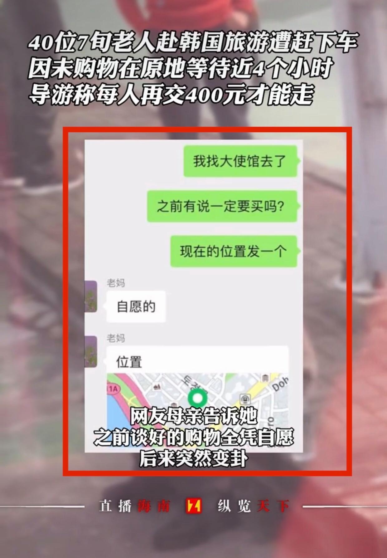 女子稱和媽媽的聊天記錄,裏面有導遊說的話,大致意思就是讓我們這邊商量好每人給400人民幣才能繼續下面的行程,因爲之前購物的人很少,所以老人們午飯也沒有喫,現在韓國已經下午5點半一了,導遊不肯走,晚飯八成也沒有着落了。希望大家幫我點點熱度能讓更多人看到,駐韓大使館那邊回電讓我找文旅局投訴,但是找不到文旅局電話,我現在打給了外交部全球服務熱線,但是外交部說讓我打韓國警方報警。然後我又發了駐韓領事的電話,領事幫我現在和導遊去交涉了,只能通過溝通讓導遊把老人送回酒店。但是需要投訴的話只能去國家文旅局線上,電話據說被取消了。真心感謝大家,只希望母親她們都能平安回家。